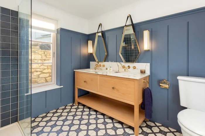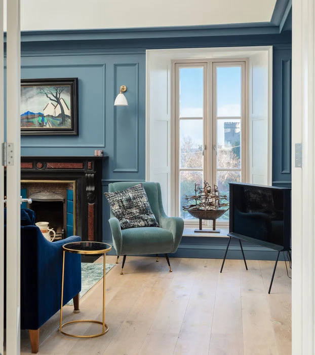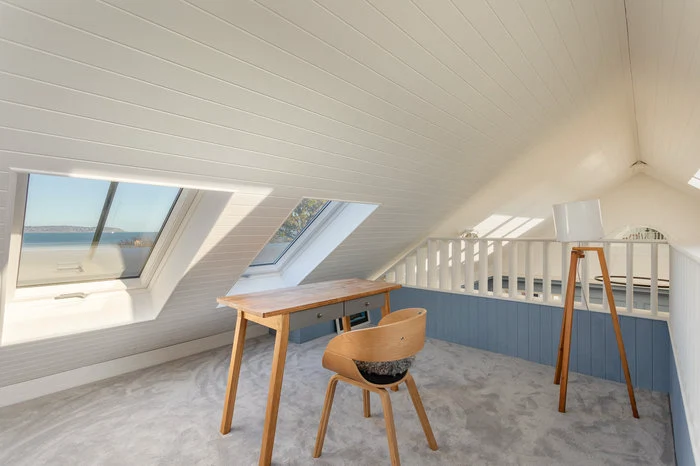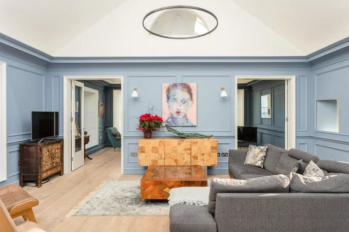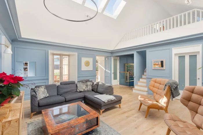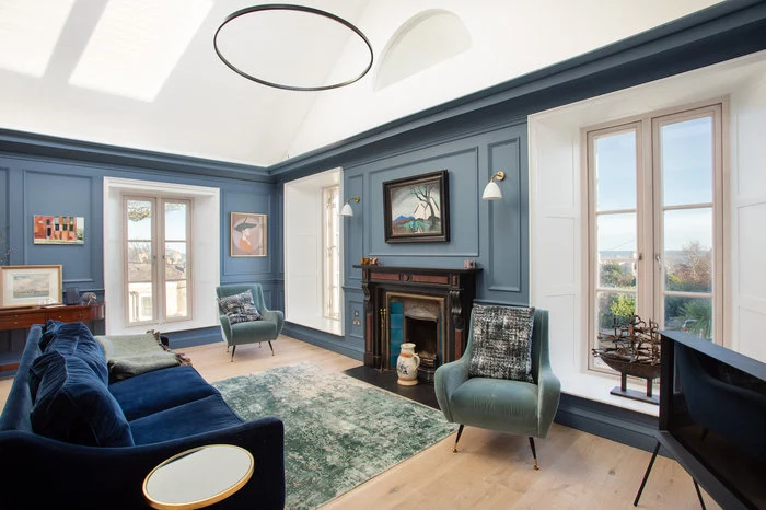 An office is located on a mezzanine level, while these three rooms are all painted in elegant, complementary shades of blue, with panelled detailing on the walls. The drawing room has double doors out to a balcony, where you can enjoy a view out to sea. There is also a hidden door in this room that leads to another small room, which could be used as storage or a small gym.