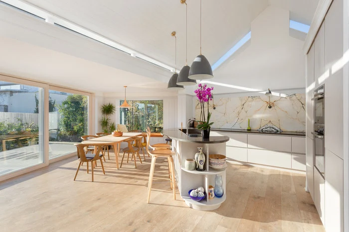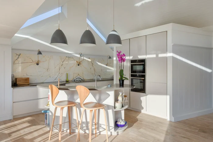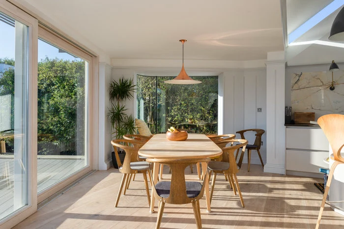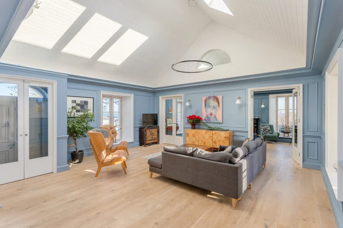 The main living space is located on the first floor to maximise the sea views the house enjoys. Three large recpetion rooms that lead into each other enjoy double-height ceilings and skylights, making them feel spacious and bright, while an Irish oak floor continues through all three rooms.