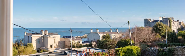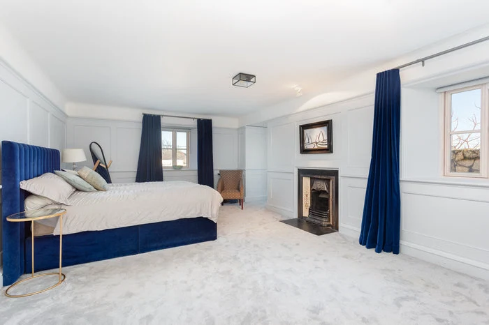 The bedrooms are located on the ground floor, and there are four in total. The master bedroom is dual aspect with sea views and has a cast iron fireplace, as well as a dressing room and en-suite bathroom.