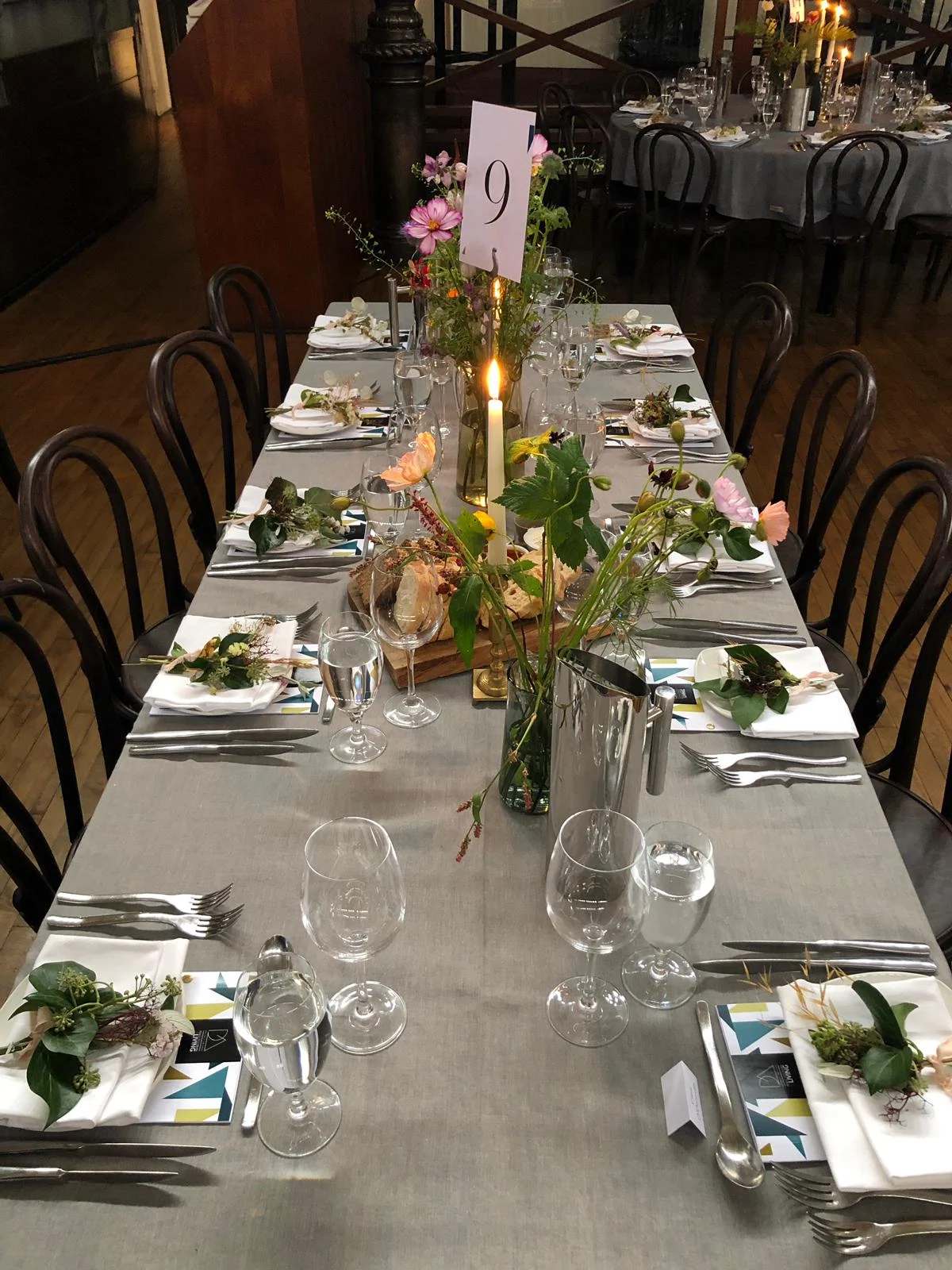 Elsewhere in the bar, a Shane O’Driscoll artwork entitled “And the Beat Goes On” attracted plenty of attention as people snapped selfies in front of it. Soon, it was time to head upstairs to the domed ceiling of the main restaurant, where guests were greeted with an Irish table curated by stylist Ciara O’Donovan. Smoked glass Jerpoint vases held seasonal Irish flowers by The Irish Flowerfield, salt and pepper pinch pots from Arran Street East, beautiful linens from Stable of Ireland, candles from Rathbornes 1488, flower ties by Kathryn Davey and Historic Interiors bentwood chairs.