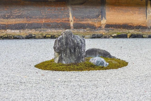 Completing a small zen garden can be done simply by arranging larger stones and moss. This punctuates the lined surface, adding variation and, importantly, encouraging contemplation, according to Buddhist monks. While the traditional Kyoto temple gardens are unplanted and waterless, there are alternative styles. Tea gardens incorporate lanterns, stepping stones and water, giving the space a dramatic Eastern effect.