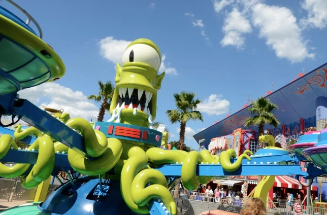 We had to try a Krusty burger and a lard boy giant donut and then rolled ourselves into the younger children’s area which includes a dance party with Barney, the Woodie Woodpecker rollercoaster (which is a good introductory rollercoaster for children) and one of the surprise hits of the week, the Curious George ball factory and play area where the children spent ages hoovering up softballs with giant vacuums and then firing them at us out of their ball guns.