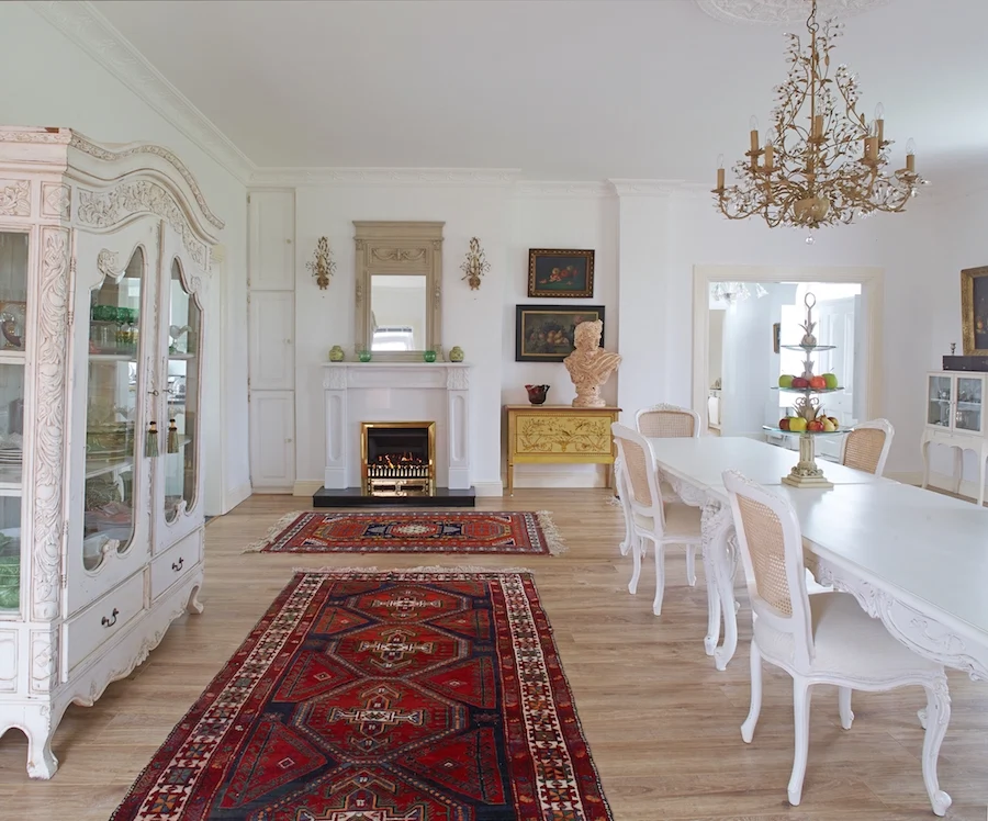 ?We chose the black and white tiles look for the entrance hall,? says owner Ginger. The tiles were sourced in Right Price Tiles in Castlebar, while Ginger spotted the hand-blown Venetian glass chandelier in a closing-down sale in Galway. The wrought-iron balustrade on the stairs was commissioned from Paul Lyons in B? Steel, Loughrea.