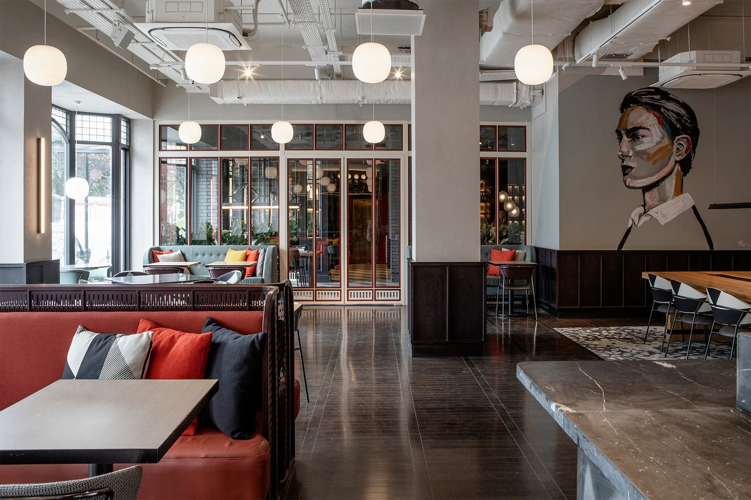 The entrance and reception of the hotel combine materials that echo the square, such as concrete and wood, as well as generous planting, so rather than abrupt contrast between indoor and outdoor, the two spaces flow easily.
