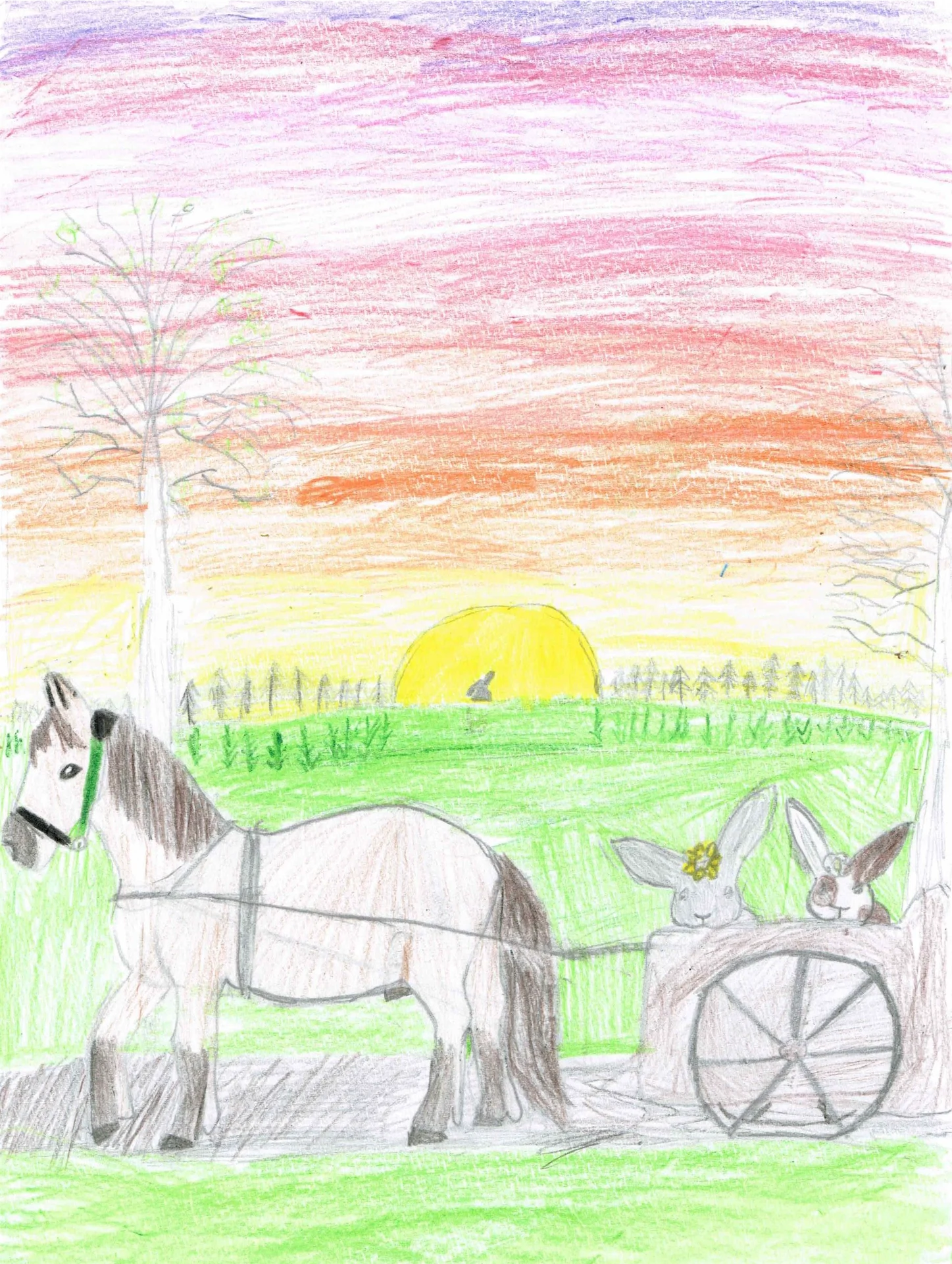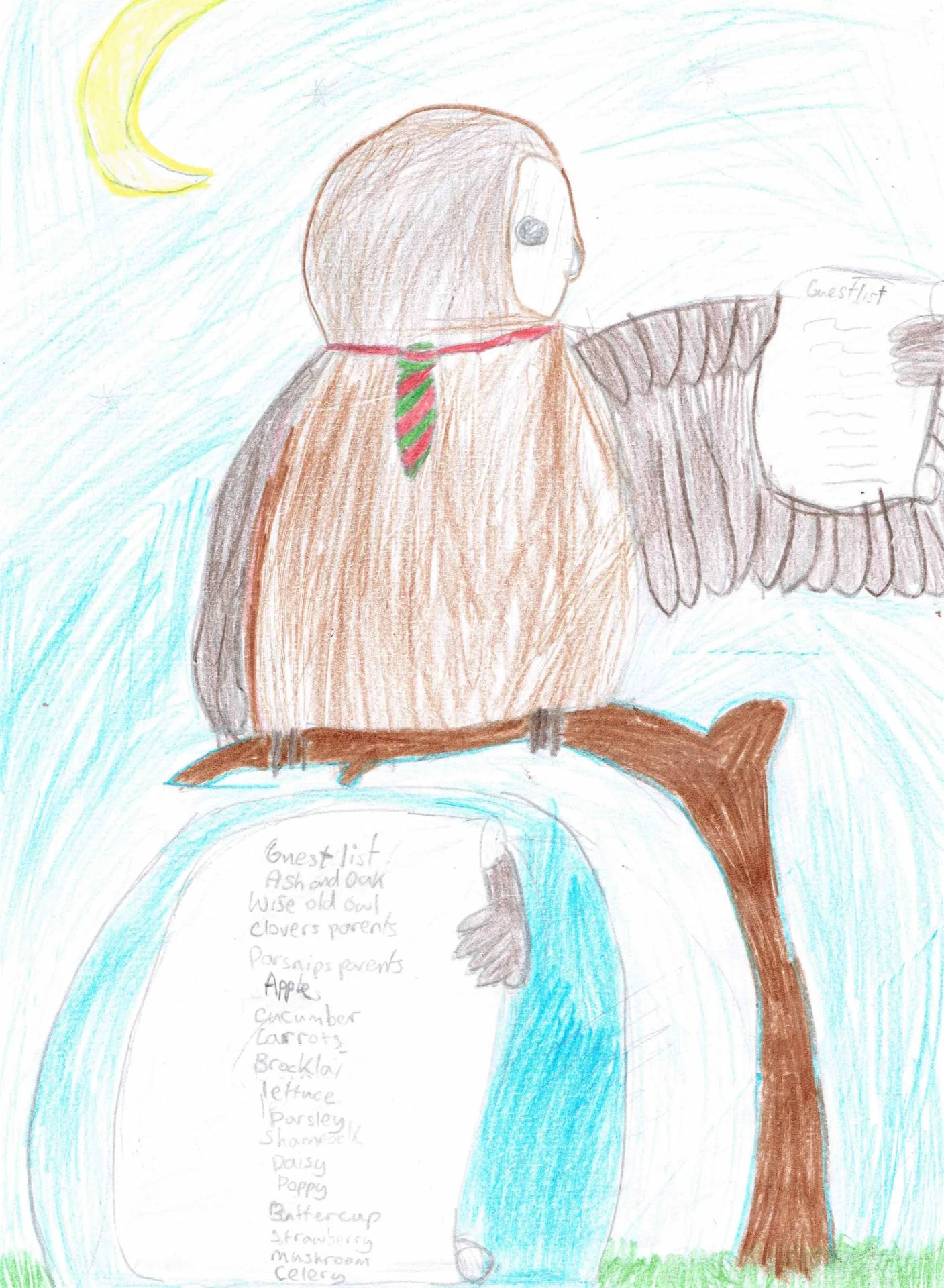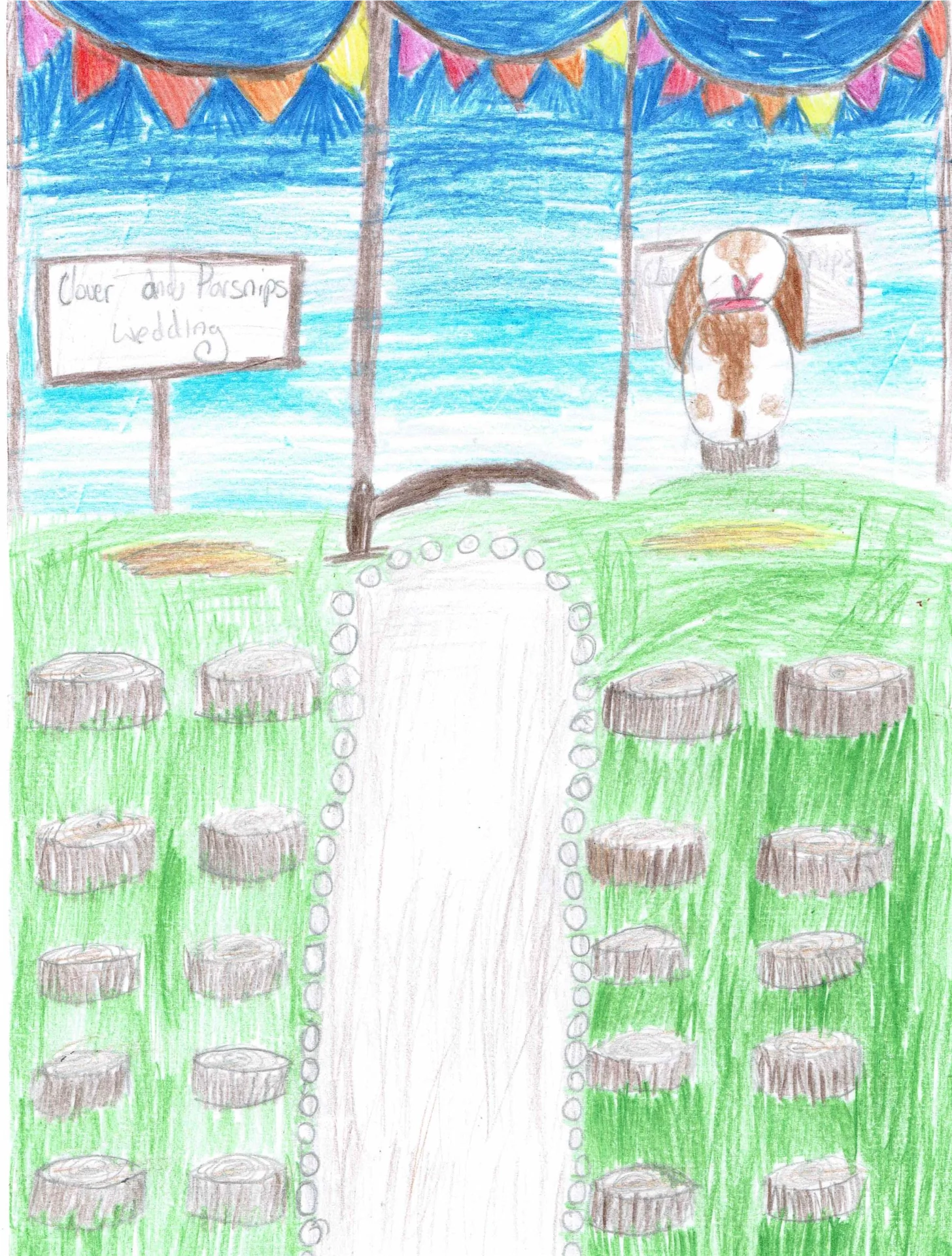All the guests arrived at 8.30 and settled down on straw blankets waiting for Parsnip and Clover to come. After a while Parsnip arrived and sat beside the wise old Owl who had made a special concession to marry them in the sunlight. A few minutes later Apple arrived with Clover and Petals dressed in their new furs. The Owl began the ceremony “Thank you all for coming here for this very special day that will unite Parsnip and Clover”. I would now like the parents to do a reading. After the readings it was time for the most important part of the wedding, the exchange of rings. “Carrots, Carrots” said Owl “Wake up! Where are the rings?” “I have them here!”