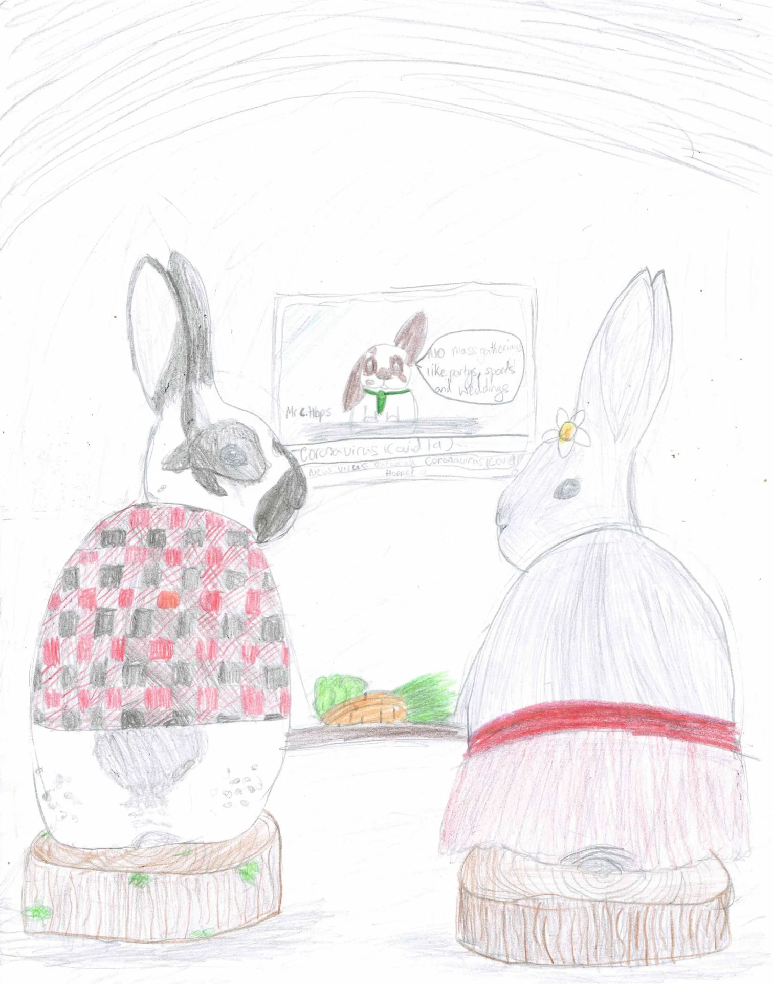 It was a Monday and Clover was making breakfast for Parsnip. When Parsnip just hopped into the kitchen, he stamped his back feet and said, “Clover, have you looked at good locations for our wedding?”. “Not yet,” Clover replied. “I will look at it later.” So Parsnip started eating his breakfast and listening to the breaking news on his iPad, about the Virus Covid 19, “Oh my God Parsnip,” said Clover. “Will it affect us? To stop spreading it you can’t socialise or do sports or any gatherings such as parties or weddings. Thanks to Covid 19 we may have to cancel our wedding!” said Parsnip.