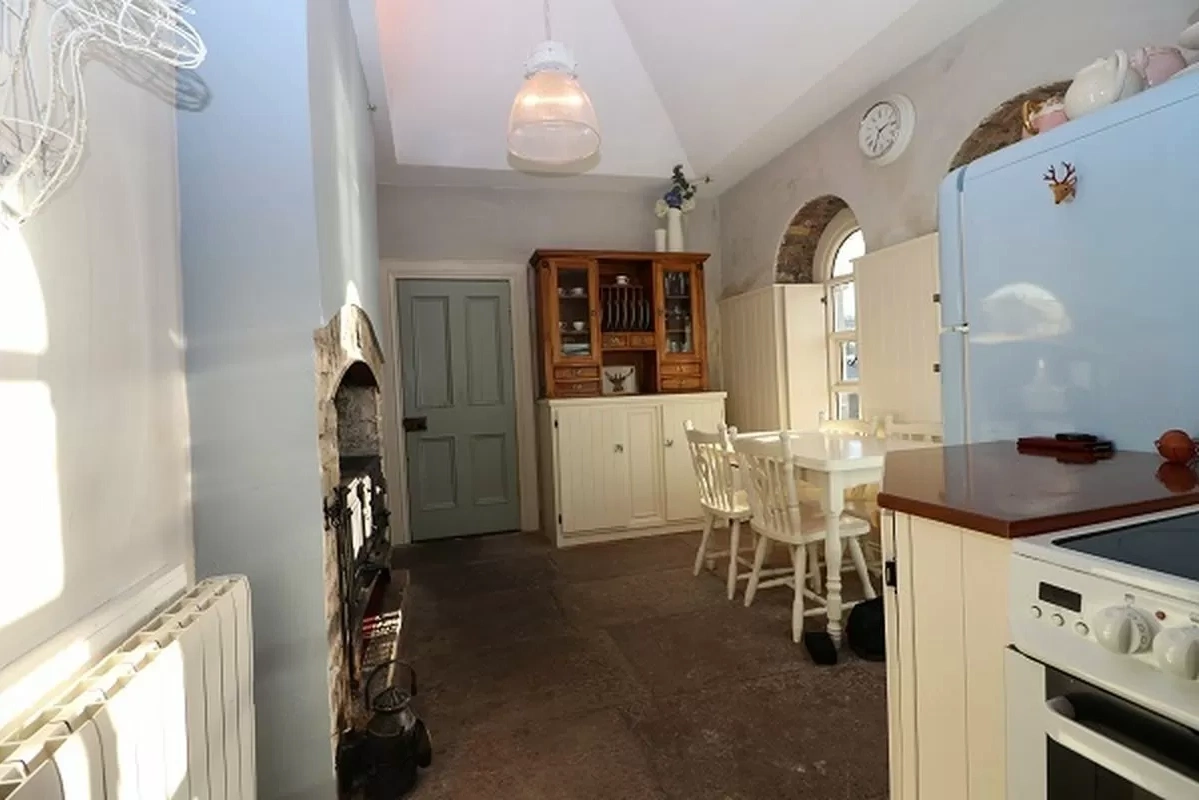 The two-bedroom home was built about 1840 and retains a number of its original features, from the curved windows and stone masonry to the old-fashioned Beetonette solid-fuel range in the kitchen.