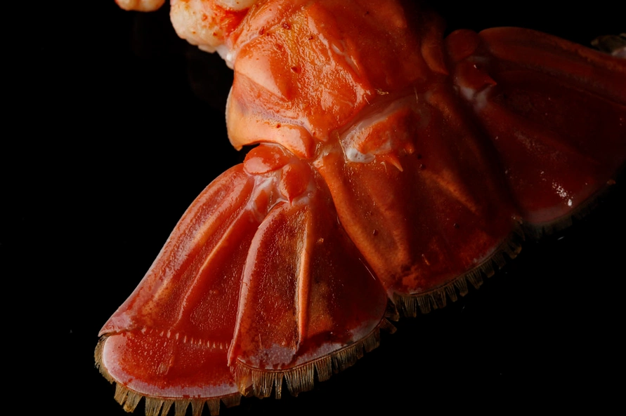 6. When the prawns are cool enough to handle, ensure you keep the head intact, remove the fan at the end of tail and pull out the intestine. Split the tail of the prawn and dot
