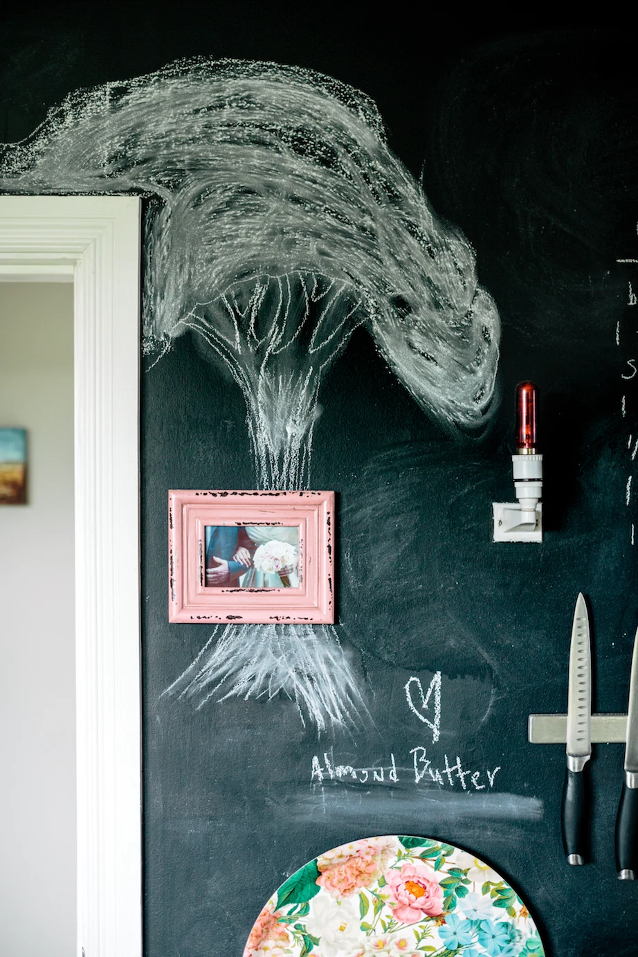 Woodie’s chalk paint provides a canvas for Kate’s nephew Bill. In the pink frame is a treasured picture of Kate and her dad on her wedding day.