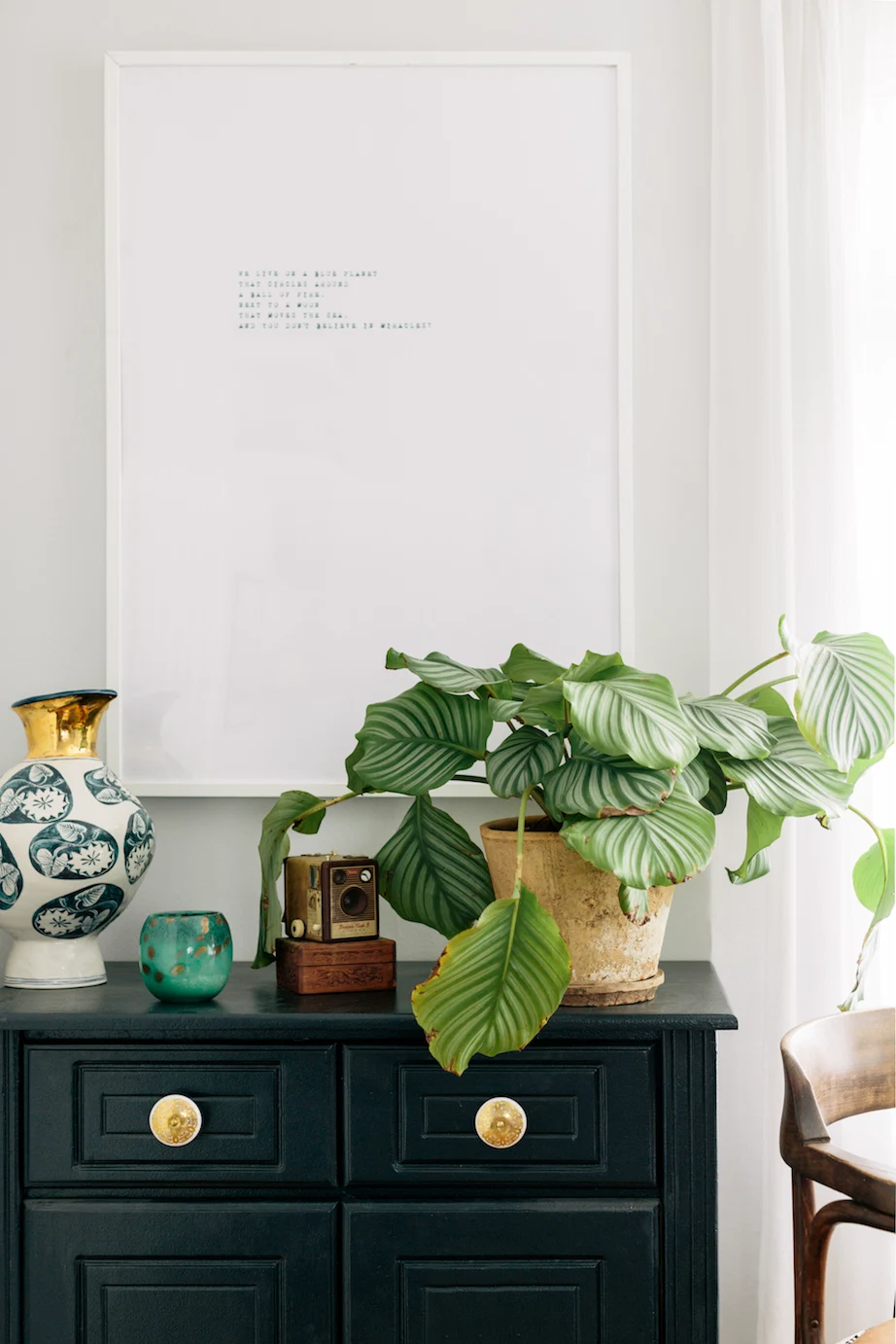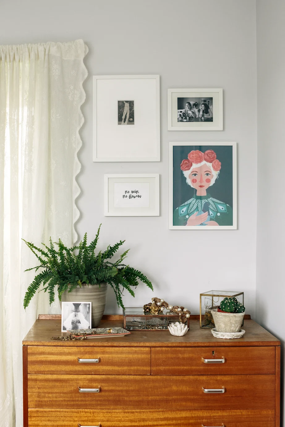 A print painting by Amy Blackwell and an illustration by Veerle Hildebrandt sit above Aunt Katie’s credenza.