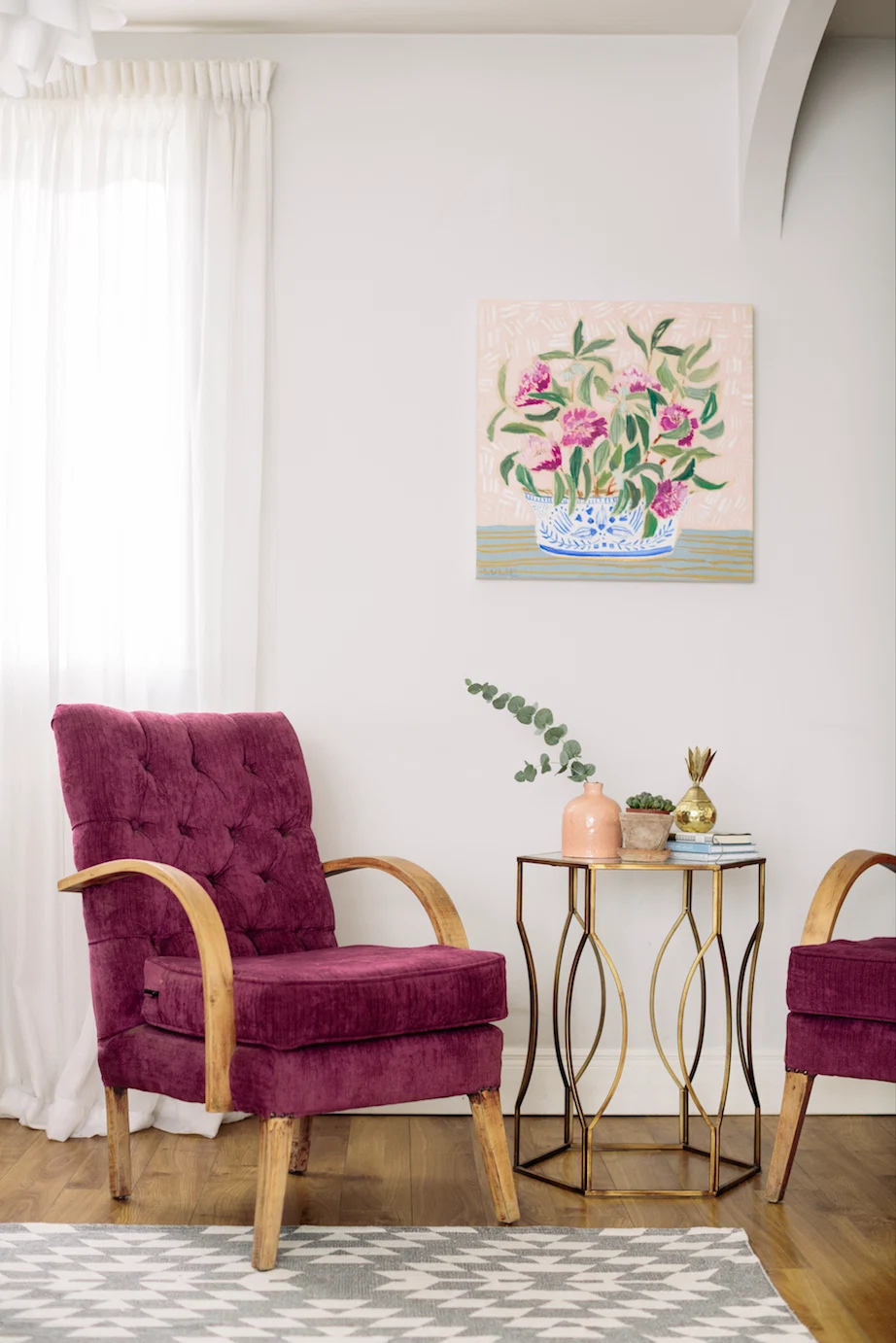 The purple button-back chairs originally belonged to Kate’s grandparents and were previously covered in a green Paisley print