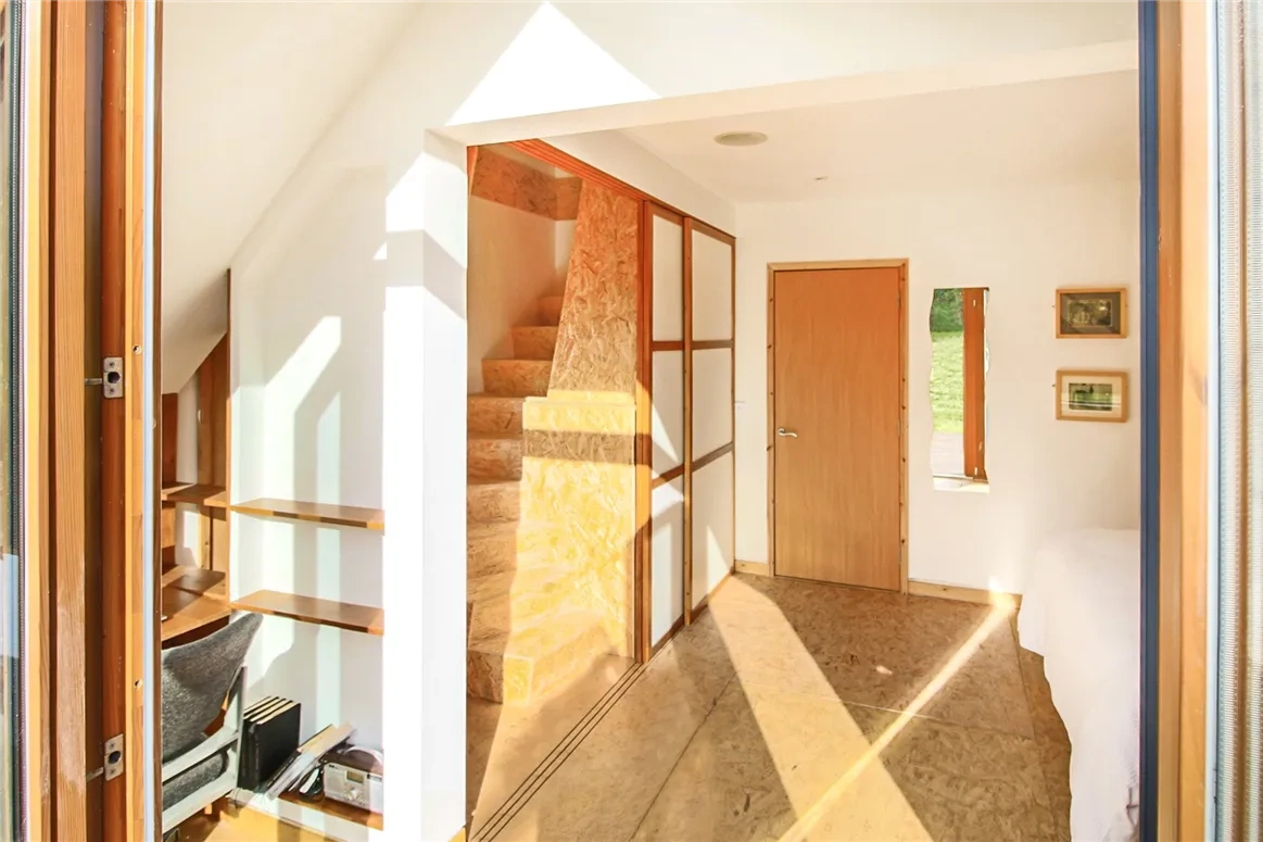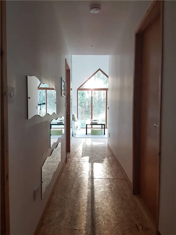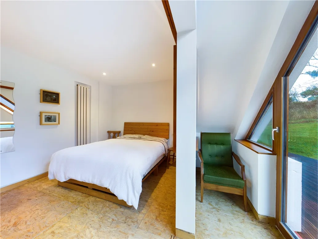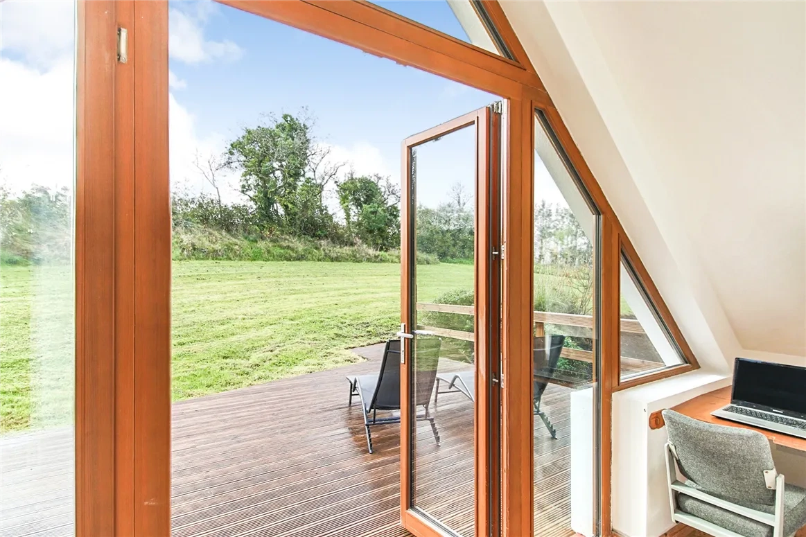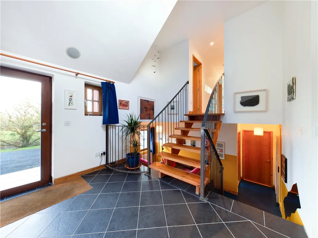 The mezzanine level has a fully glazed glass door that opens out onto slate effect ceramic floor tiles. The entrance area is bright and airy couresty of a Velux roof light and a vaulted ceiling that adds to the sense of space.