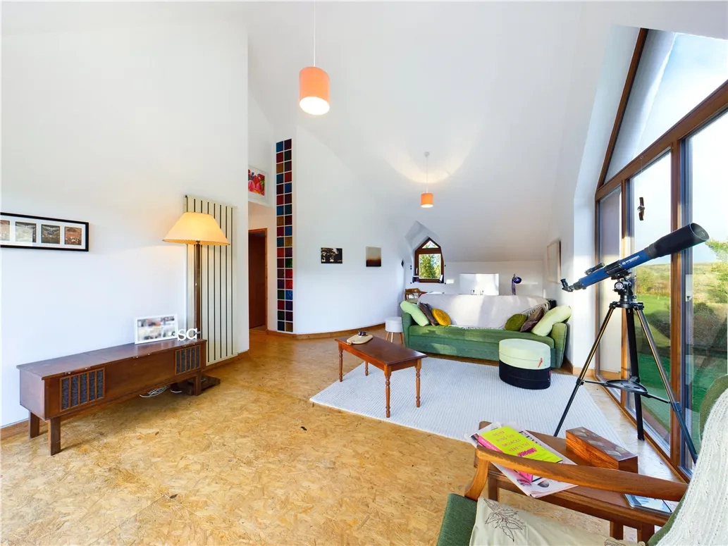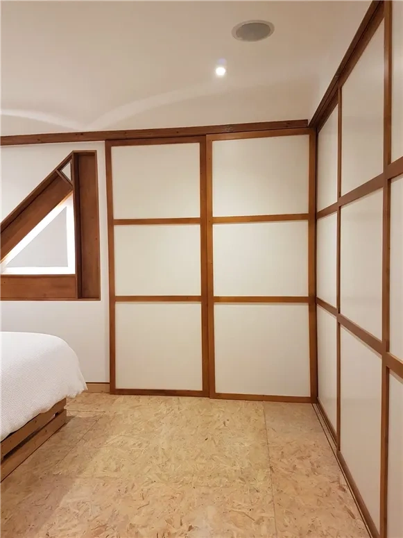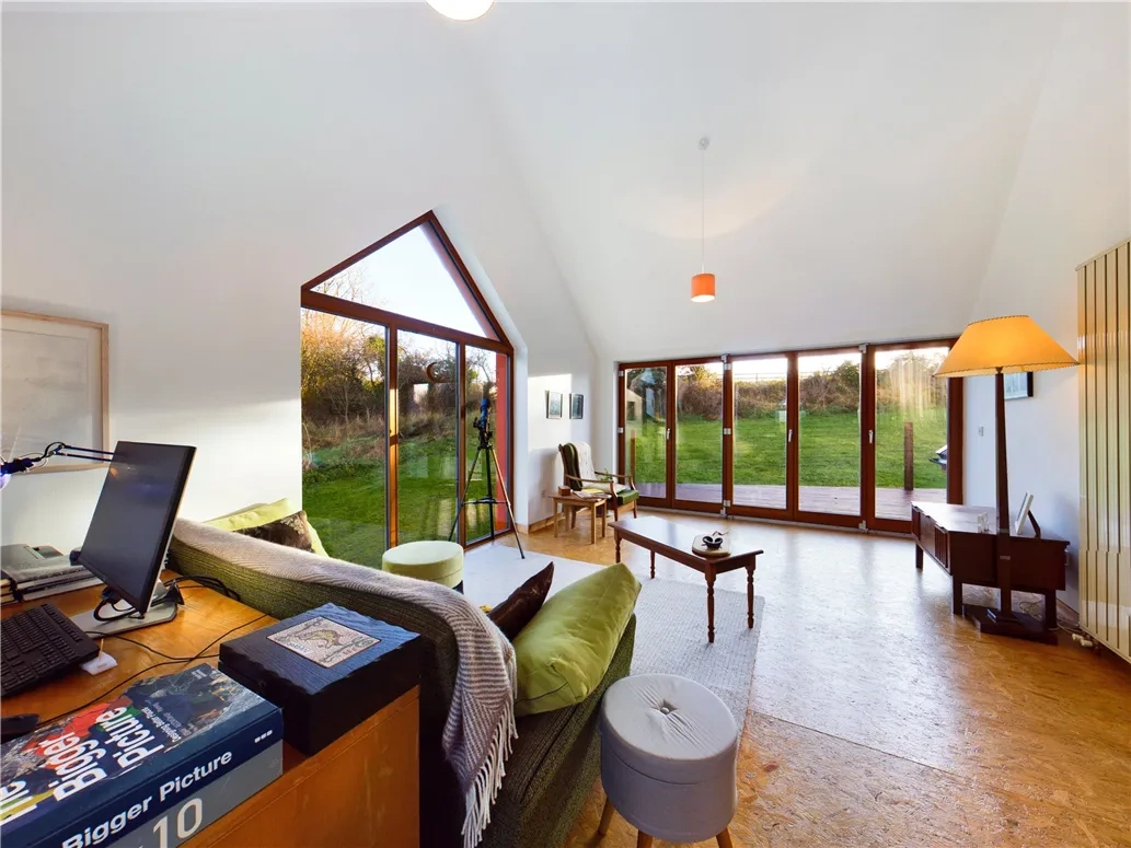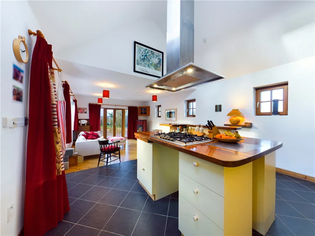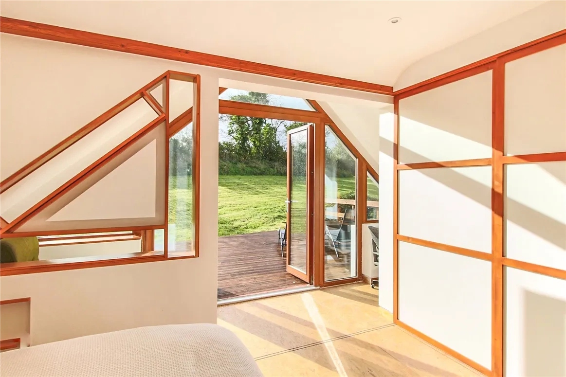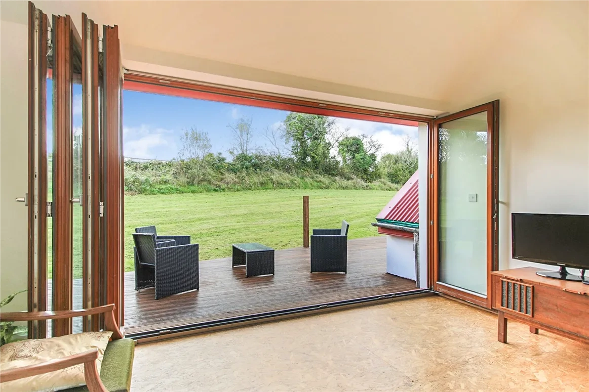 The mezzanine level has a fully glazed glass door that opens out onto slate effect ceramic floor tiles. The entrance area is bright and airy couresty of a Velux roof light and a vaulted ceiling that adds to the sense of space.
