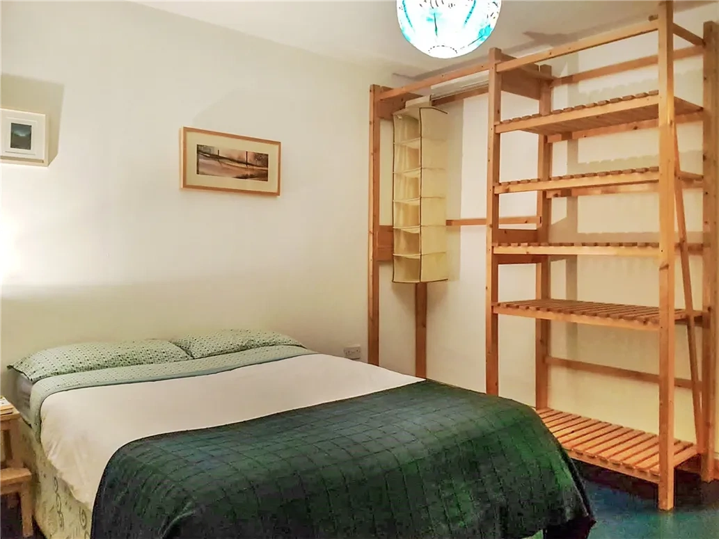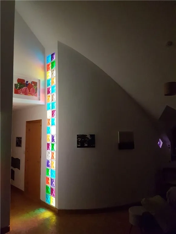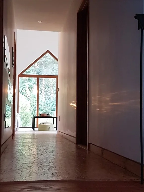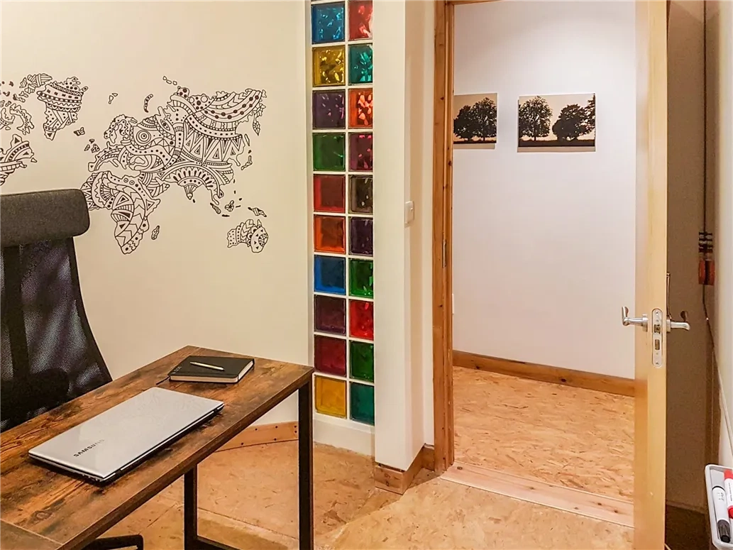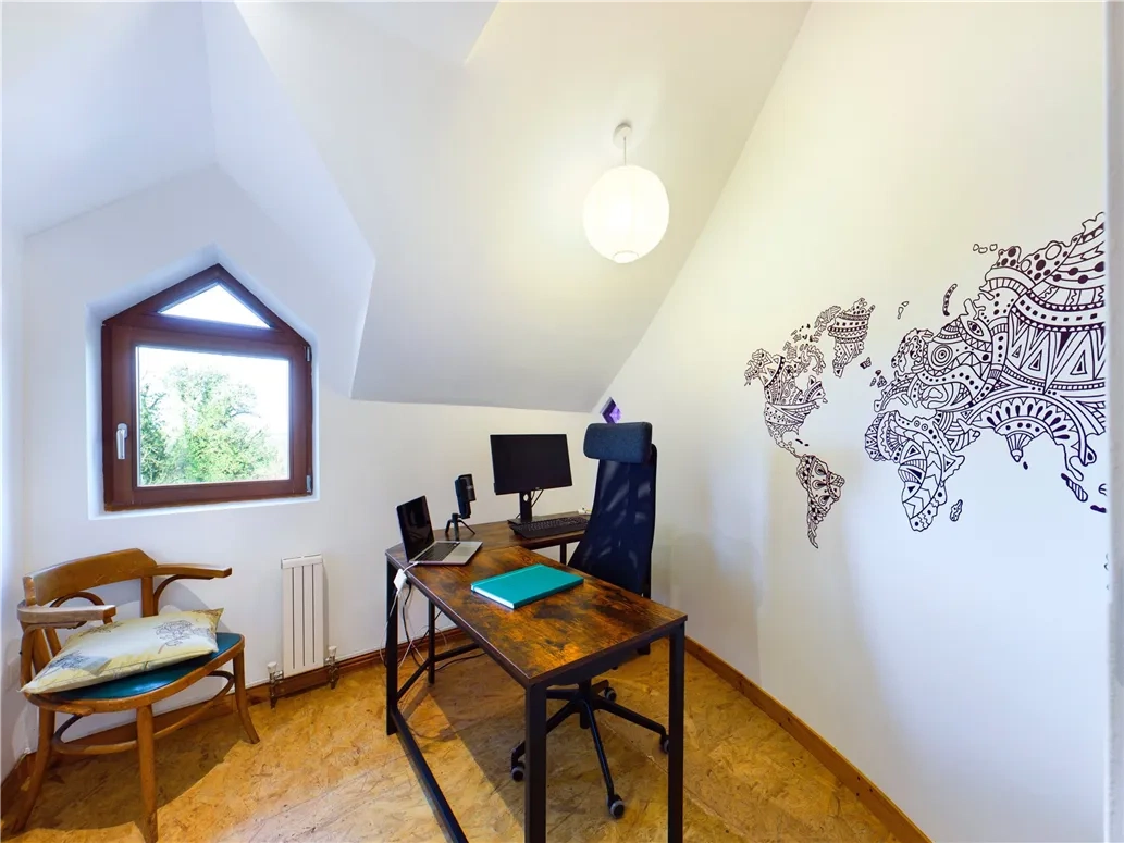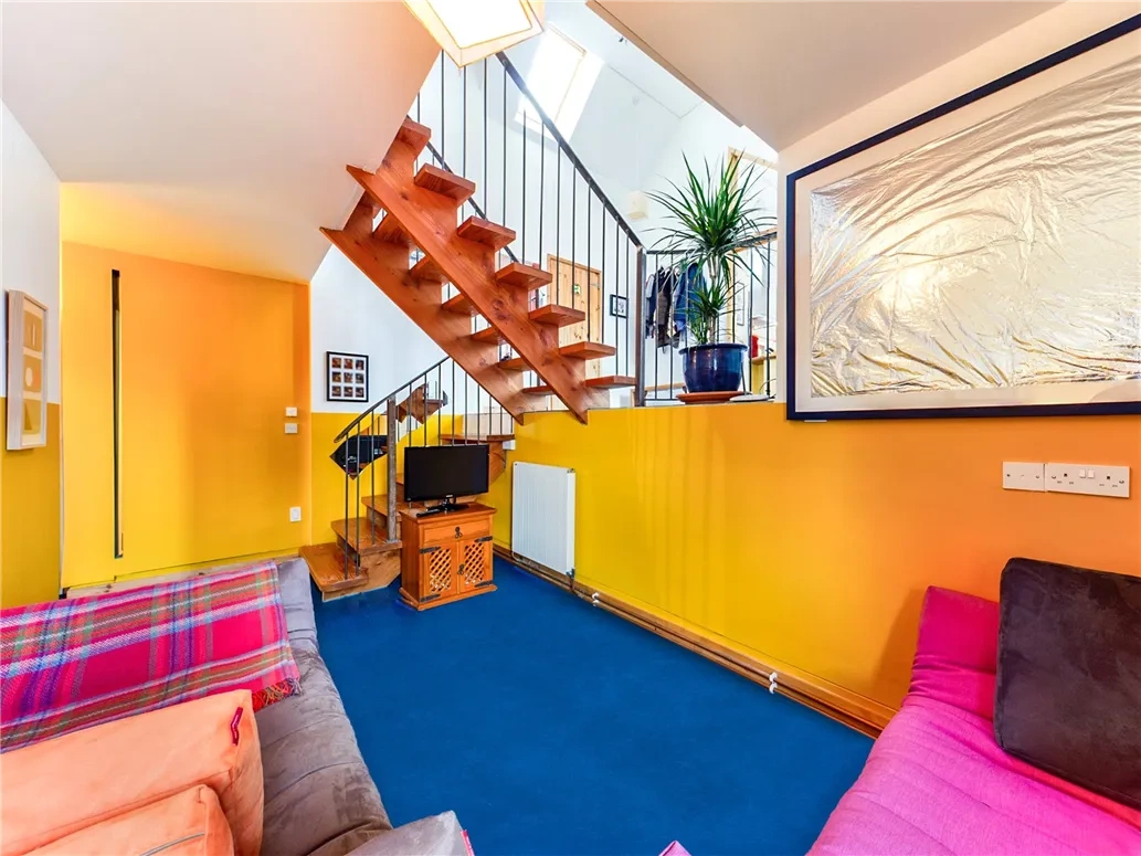 The mezzanine level has a fully glazed glass door that opens out onto slate effect ceramic floor tiles. The entrance area is bright and airy couresty of a Velux roof light and a vaulted ceiling that adds to the sense of space.