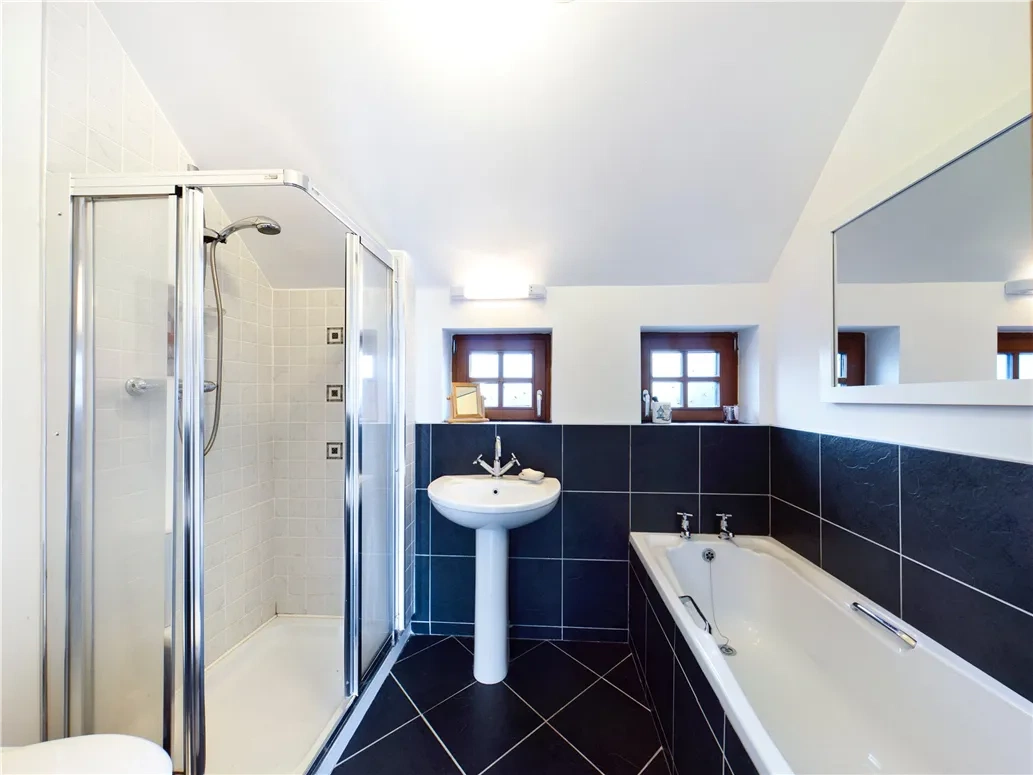The same slate tiles can also be seen in the mezzanine bathroom where it is used on both the floor and the walls. Both an enclosed shower and bathtub have been fitted.