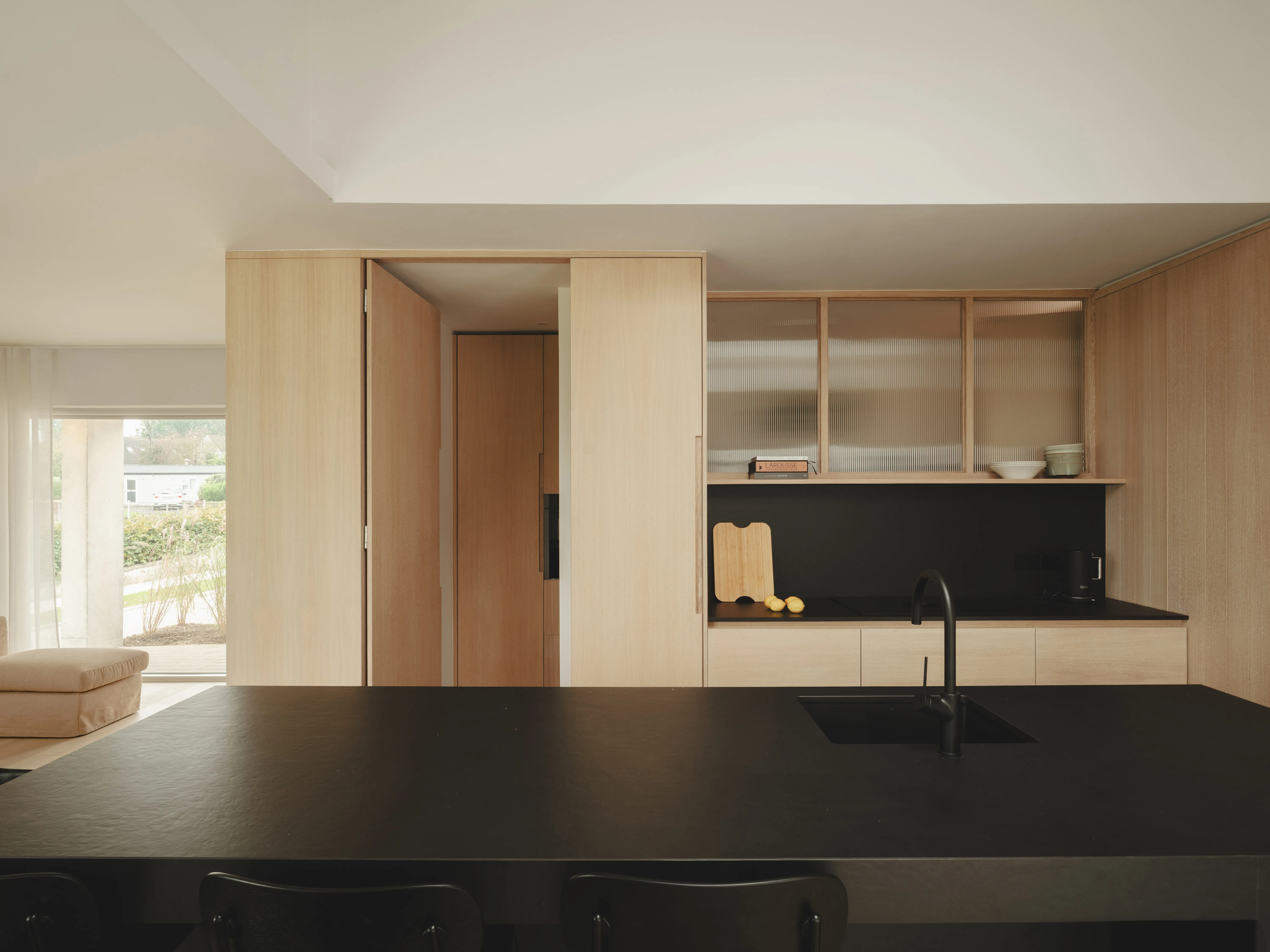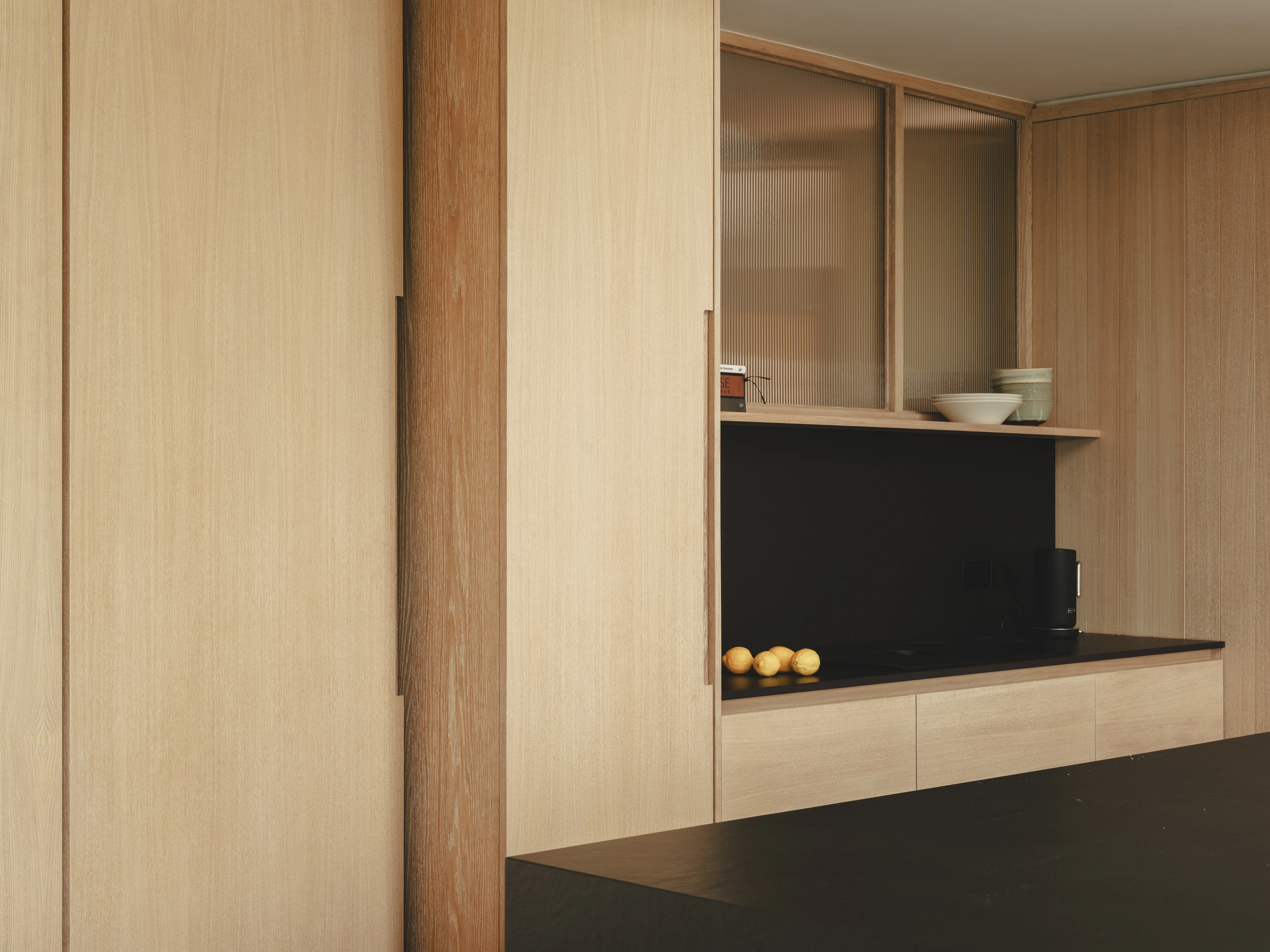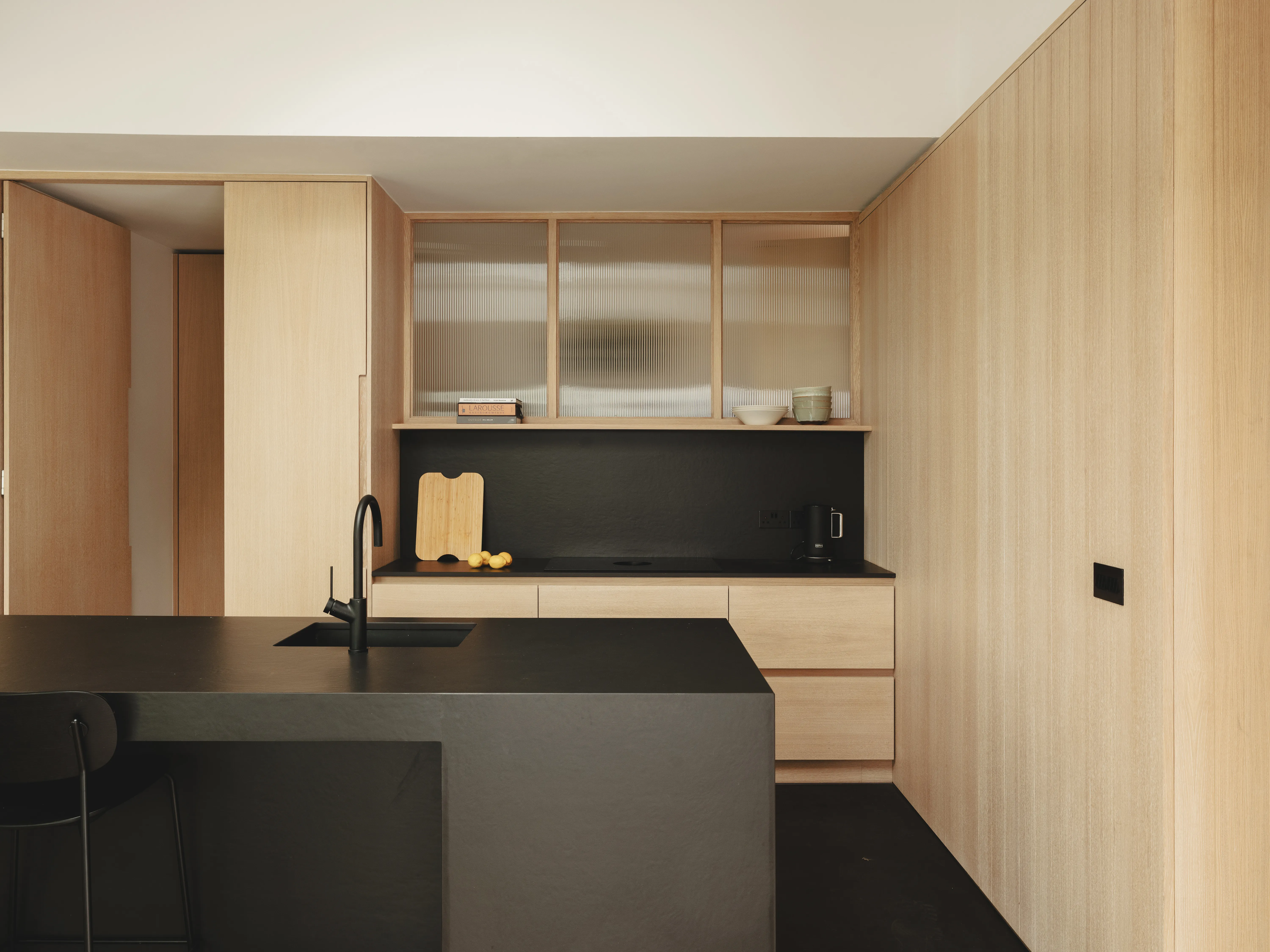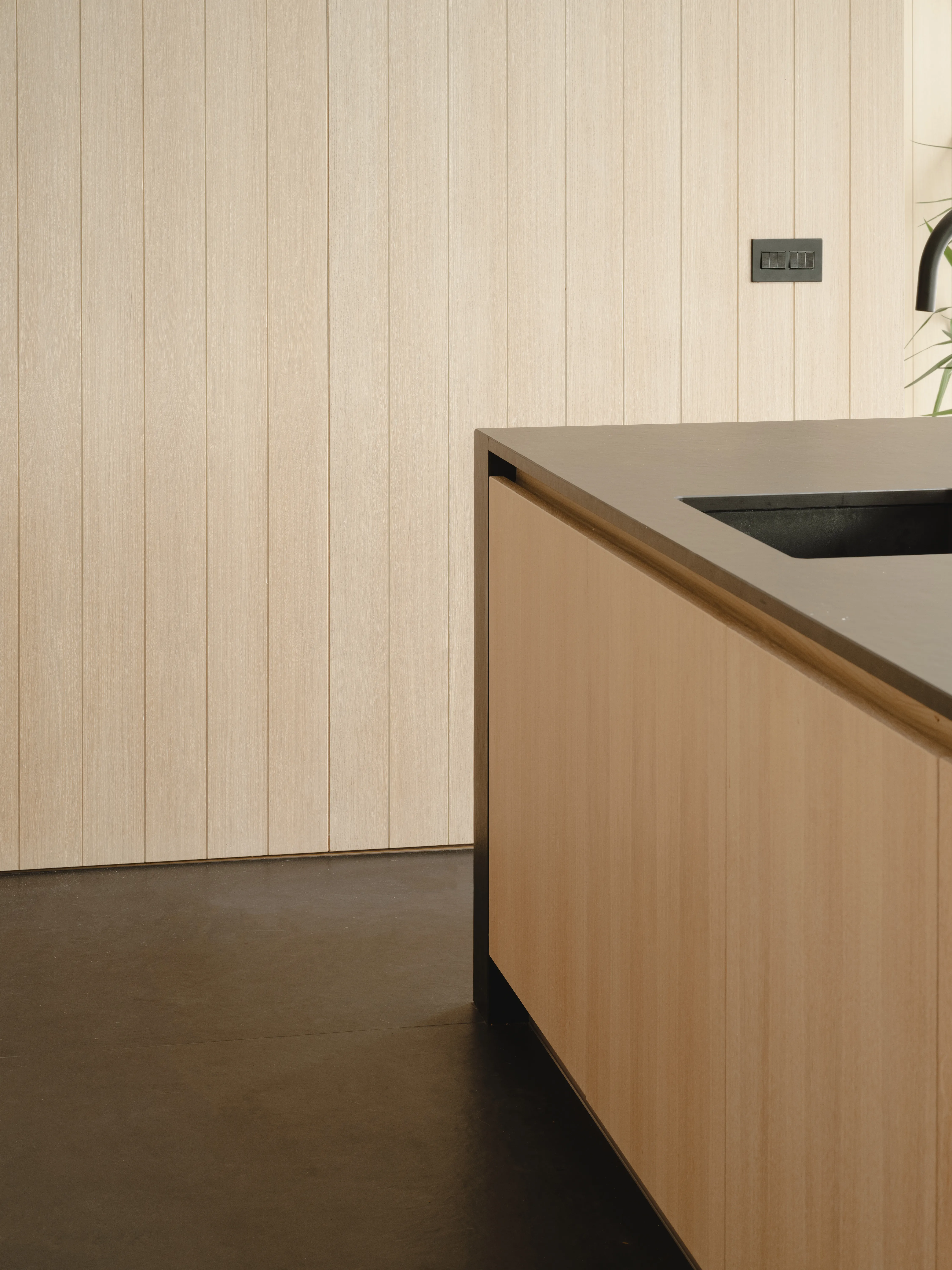 “A bespoke Accoya timber front door marks the point of entry, while a new pergola structure to the front helps establish a clearer sense of frontage that the original house lacked. Internally, washed European oak, black stone, and black metalwork were selected as natural, hard-wearing materials that will age well over time and deepen in character through use.”