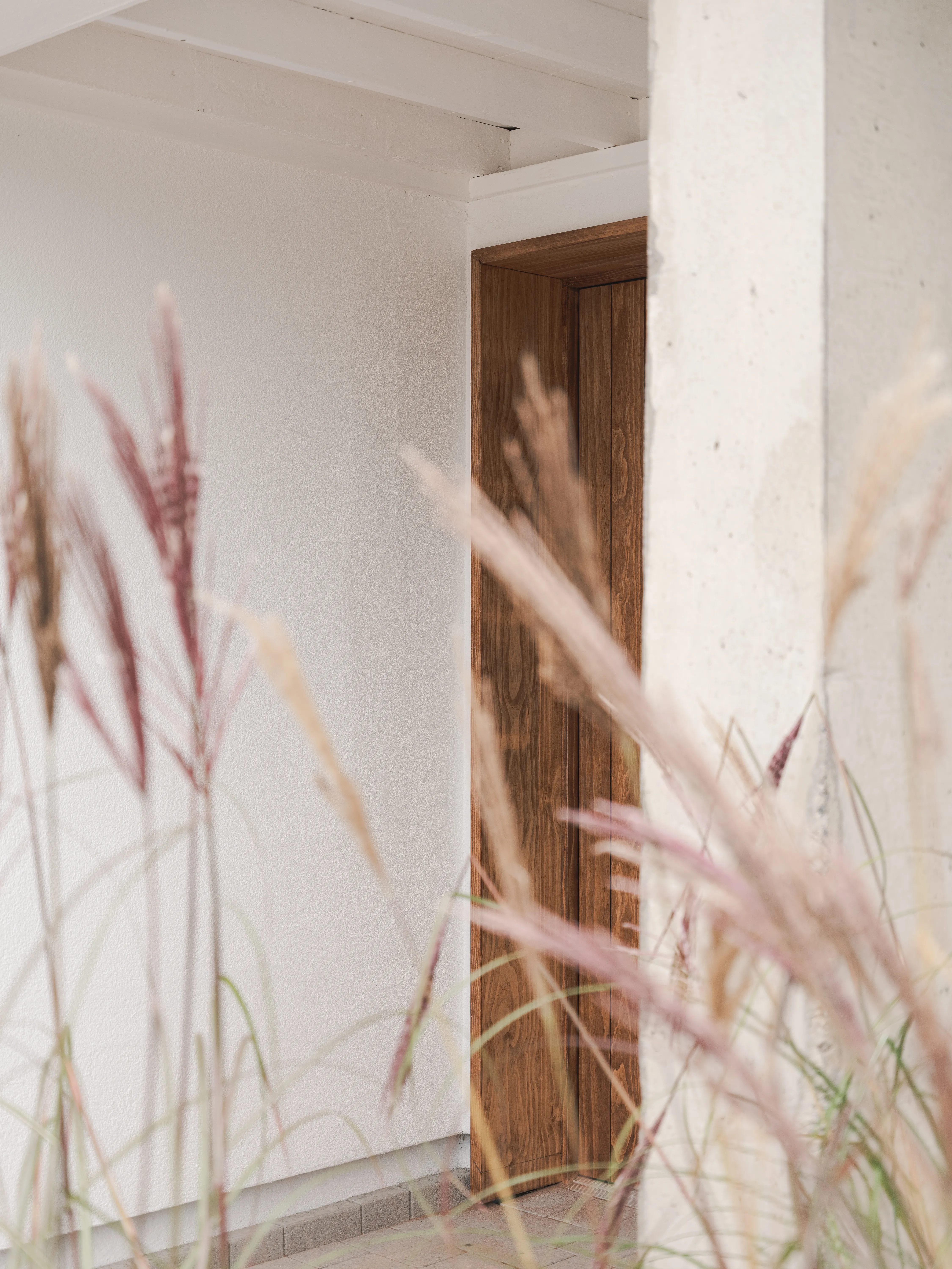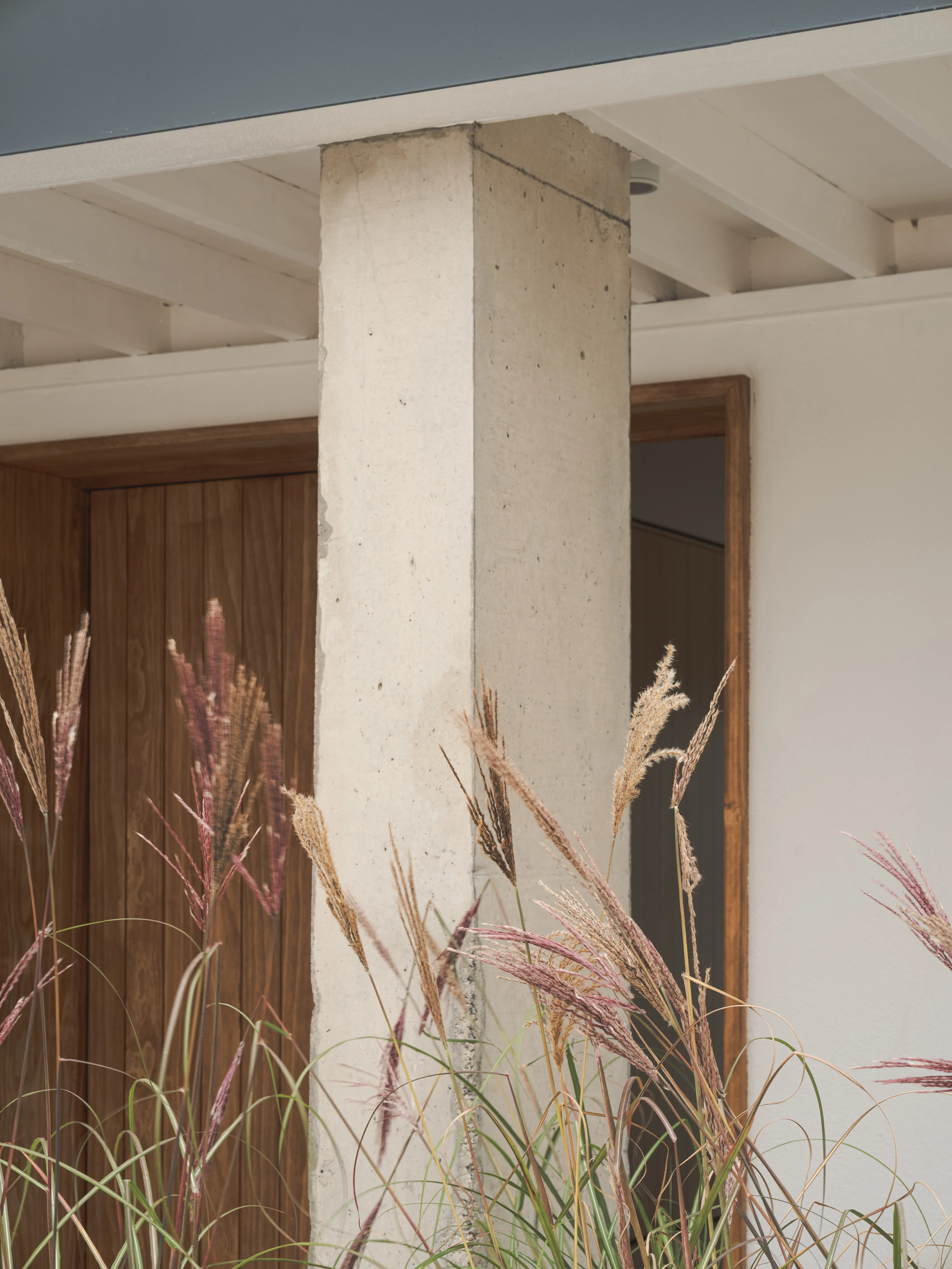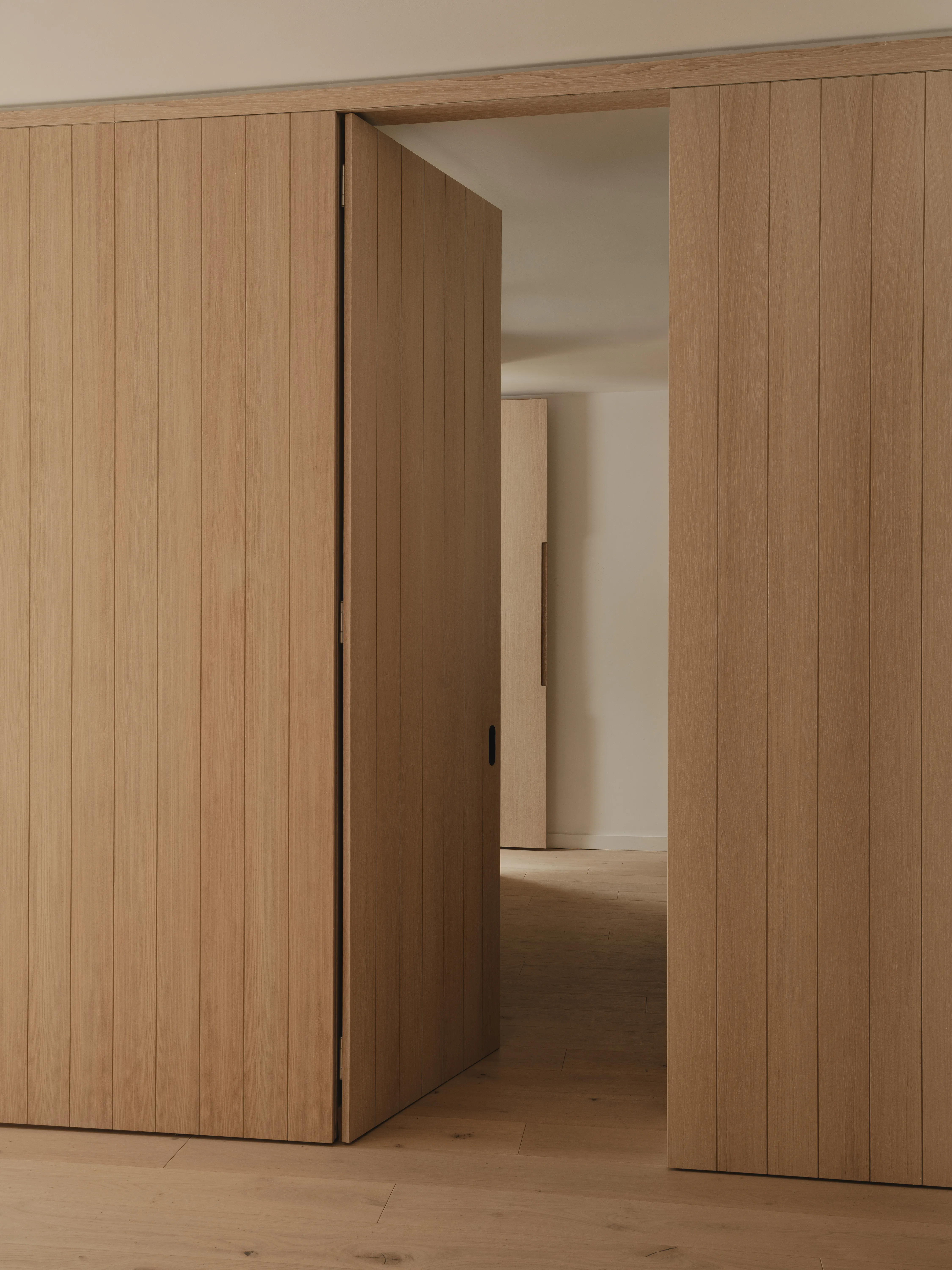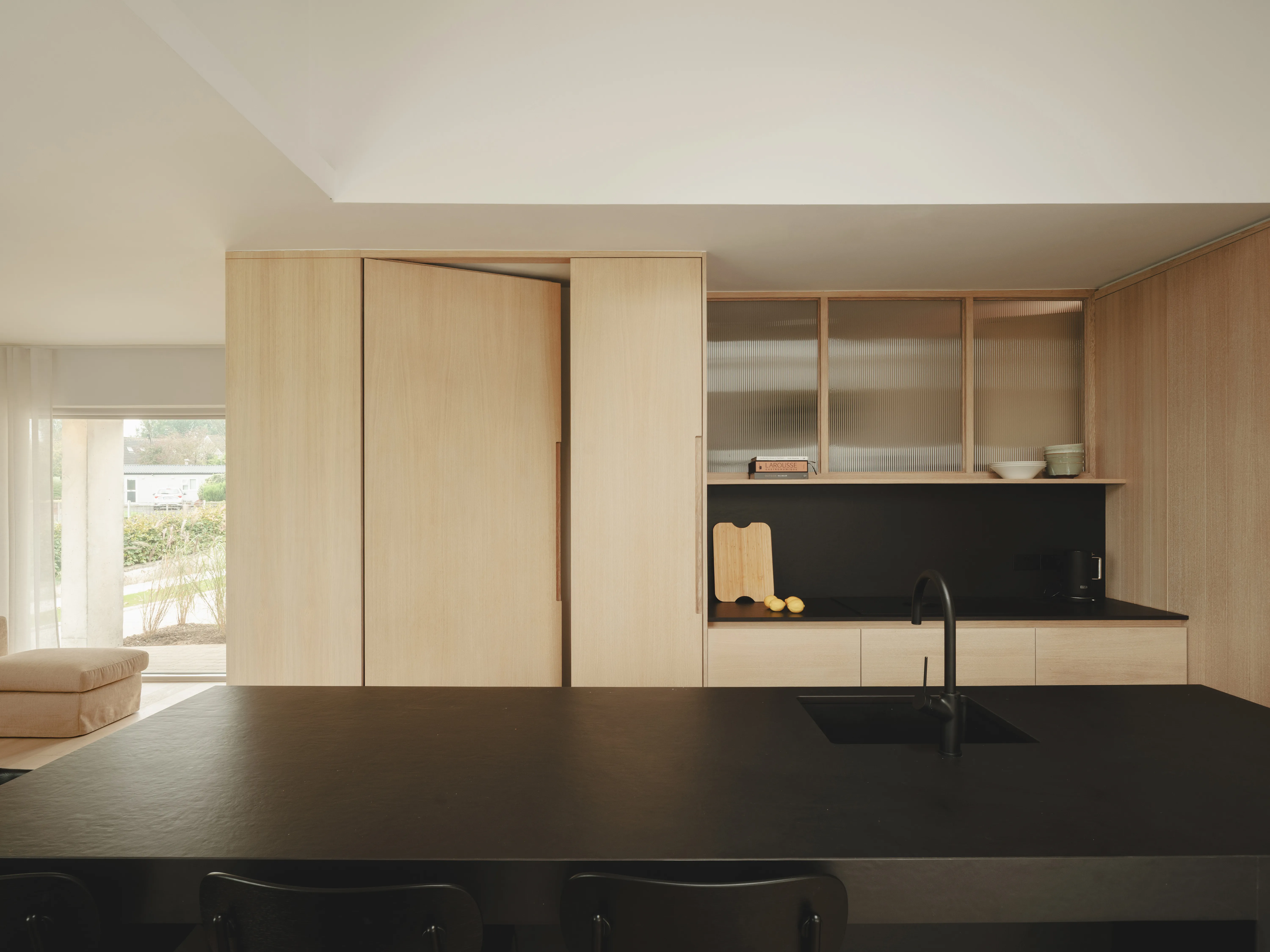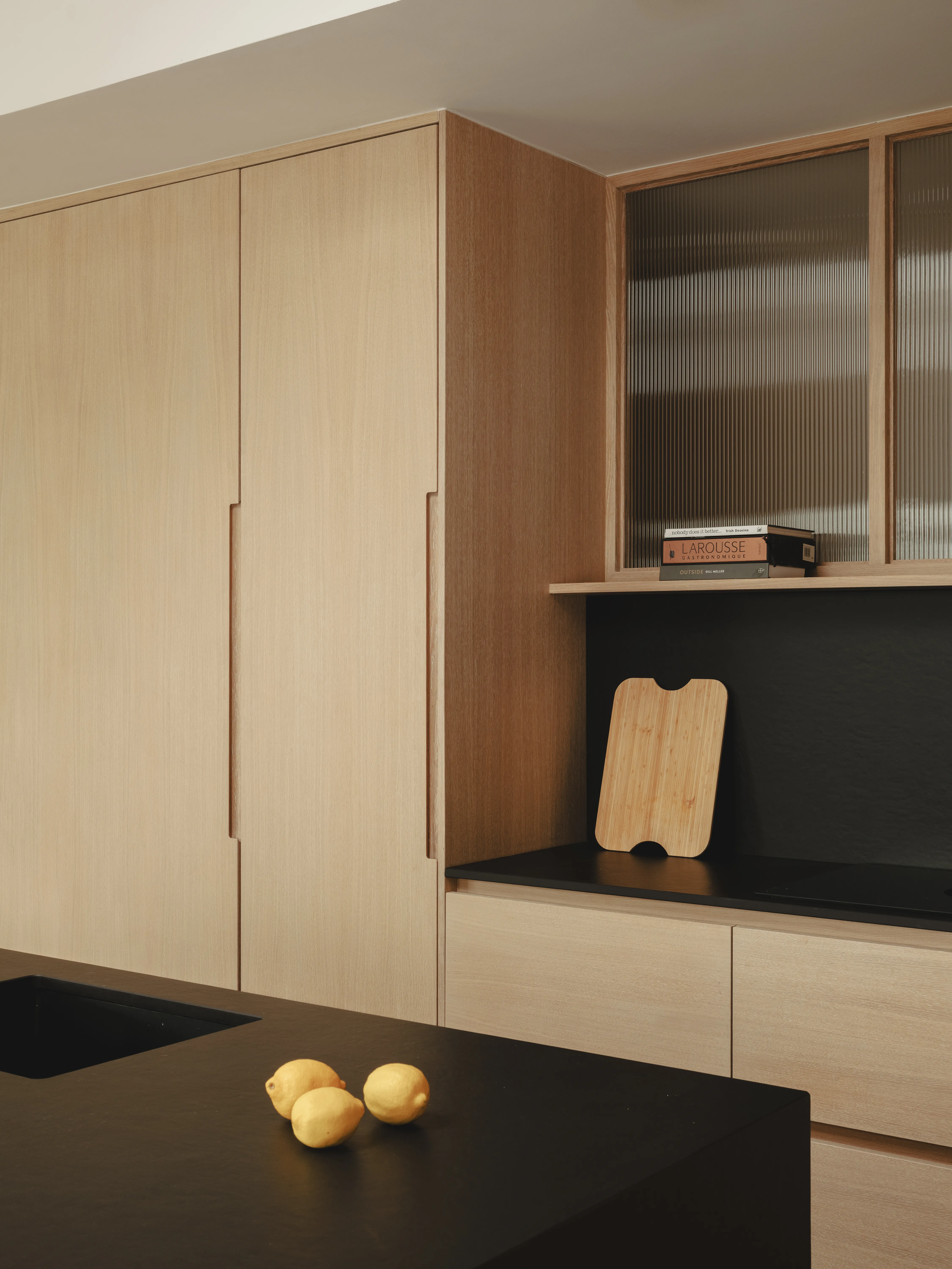 “A bespoke Accoya timber front door marks the point of entry, while a new pergola structure to the front helps establish a clearer sense of frontage that the original house lacked. Internally, washed European oak, black stone, and black metalwork were selected as natural, hard-wearing materials that will age well over time and deepen in character through use.”