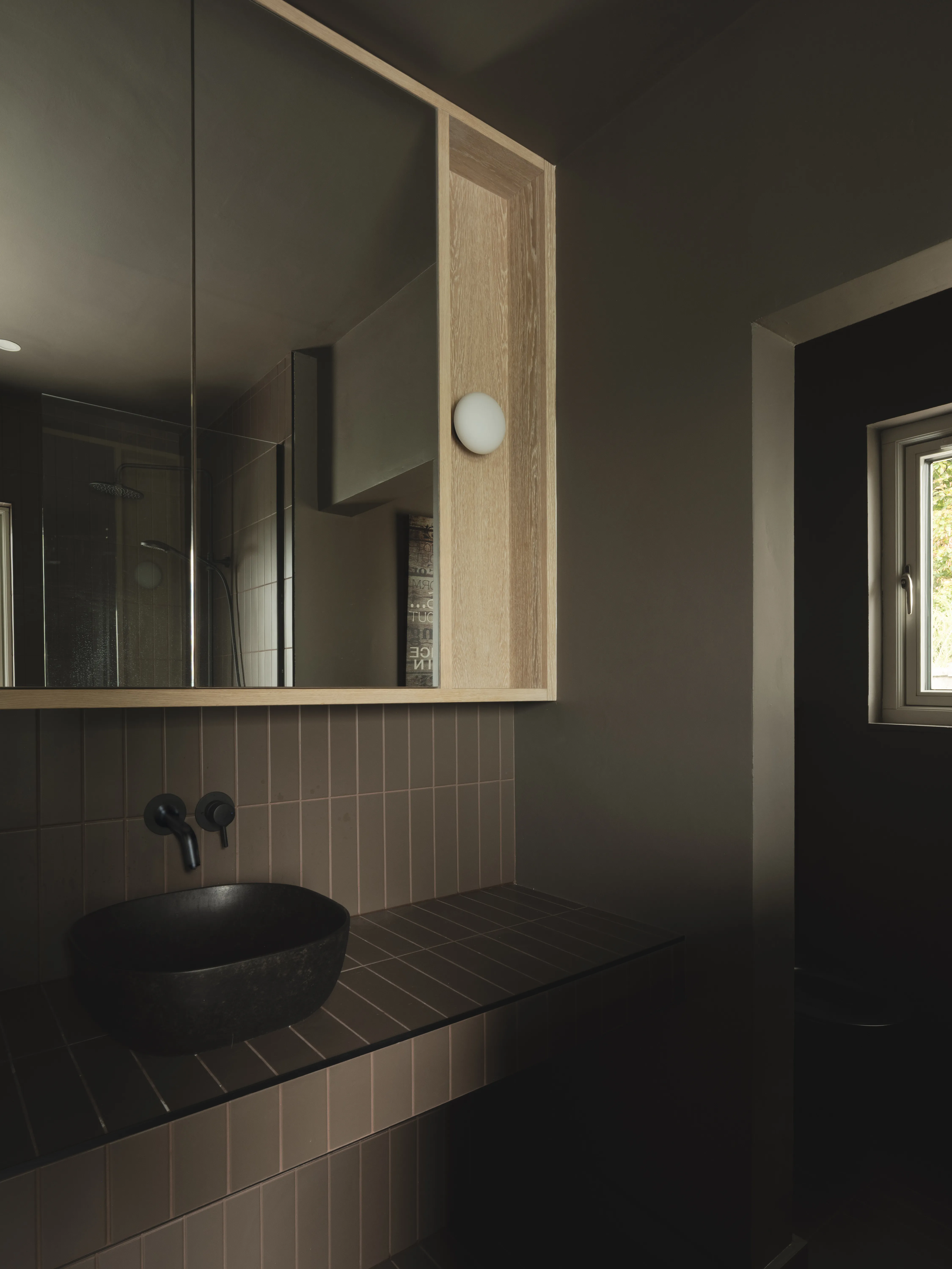 Although the original home was dark, Jamie notes that while the aim was to incorporate more natural light, they also leant into spaces that receive less daylight. “Light is used to guide movement and mark transitions,” he explains. “Window proportions were refined to improve daylight quality and outlook, and the house opens more fully to the rear, where light and landscape become part of daily life. There’s a deliberate balance of light and dark throughout: the entrance hall is intentionally a more subdued, darker space so that your eyes adjust and are drawn immediately to the views beyond, while a vaulted, top-lit volume contrasts this by welcoming you into the brighter, more public social areas of the home.”