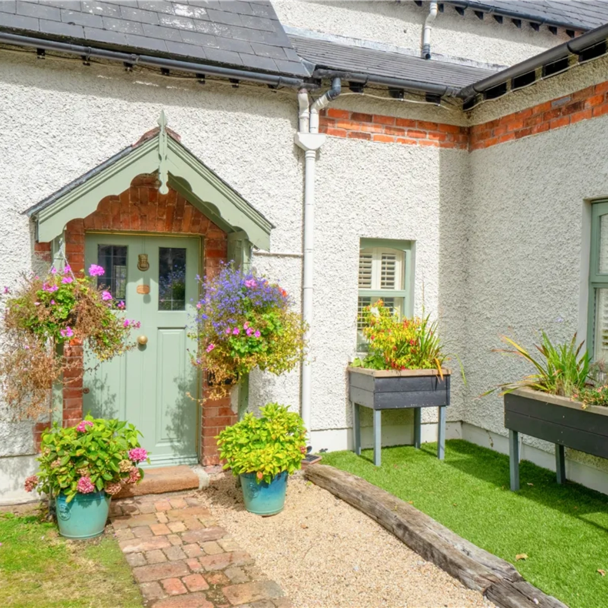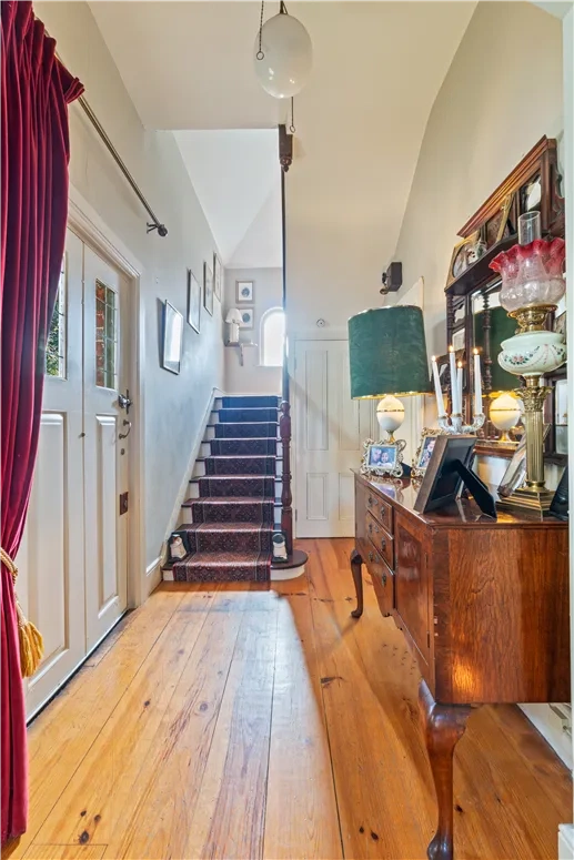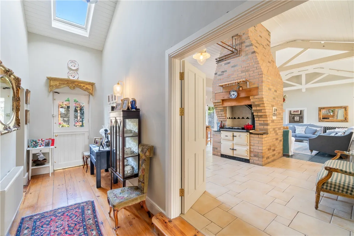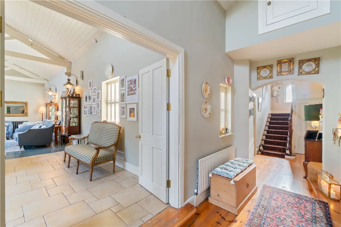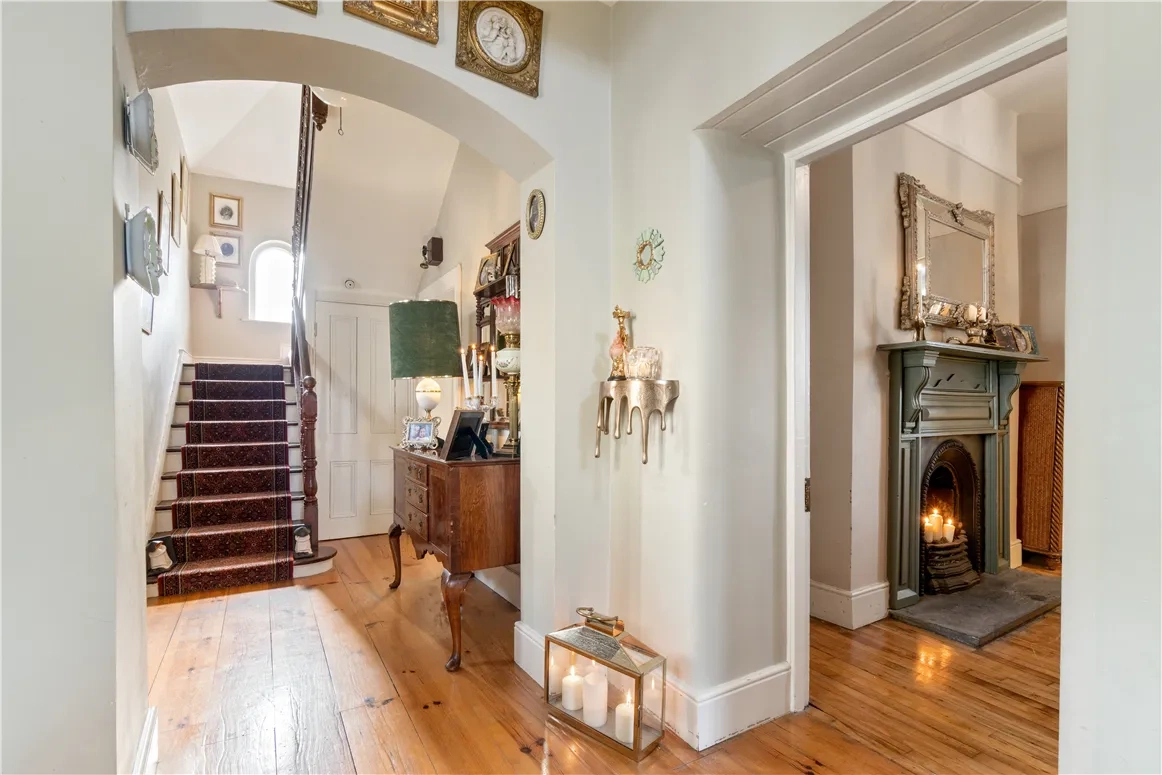 A red brick path leads up to the front door where you’ll see a plaque inscribed with the date the property was built. An attractive porch opens onto a warm and inviting entrance hall with honey-coloured wooden floorboards.