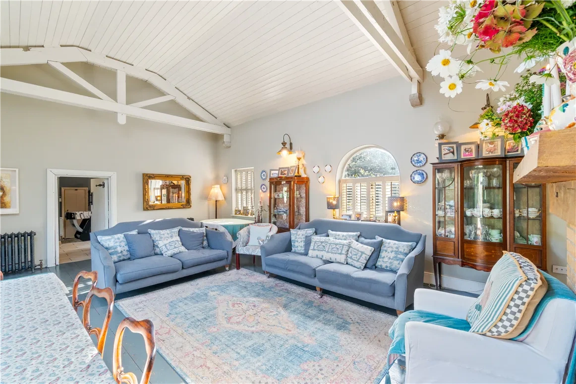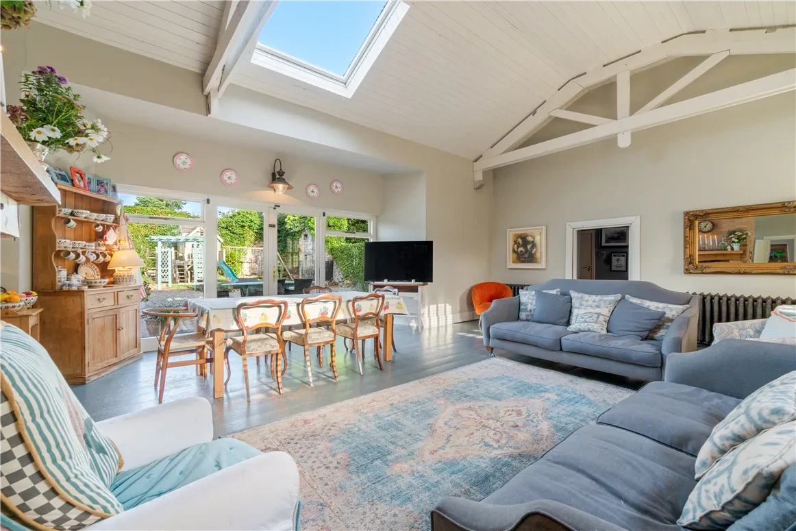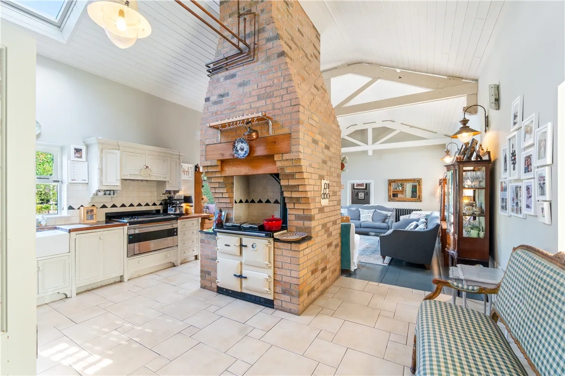 Down the hallway – with its three-metre-high ceilings – double doors guide the way into the open-plan vaulted living space; the real heart of the property. A brick chimney echoing the historic past of the home houses a Rayburn cast iron range cooker in the kitchen and a generous wood-burning stove in the living area.