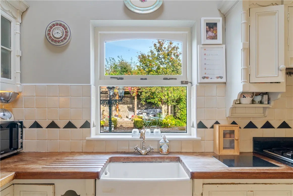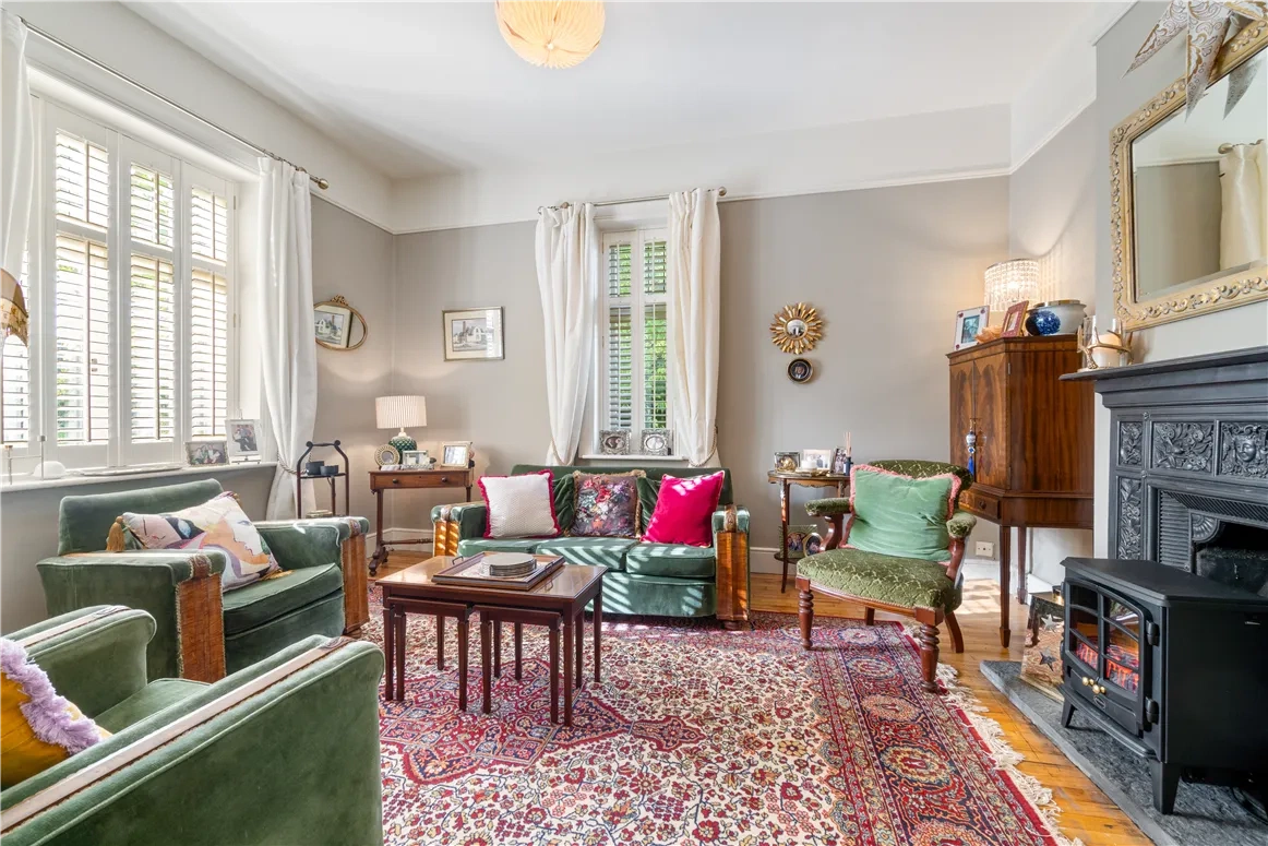 Further inside is the sitting room, boasting a cast iron fireplace. Ideally situated to the front of the property, its dual aspect takes advantage of the wonderful views of both the canal and the cherry trees, wildflower meadow and wild Irish hedge to the side.