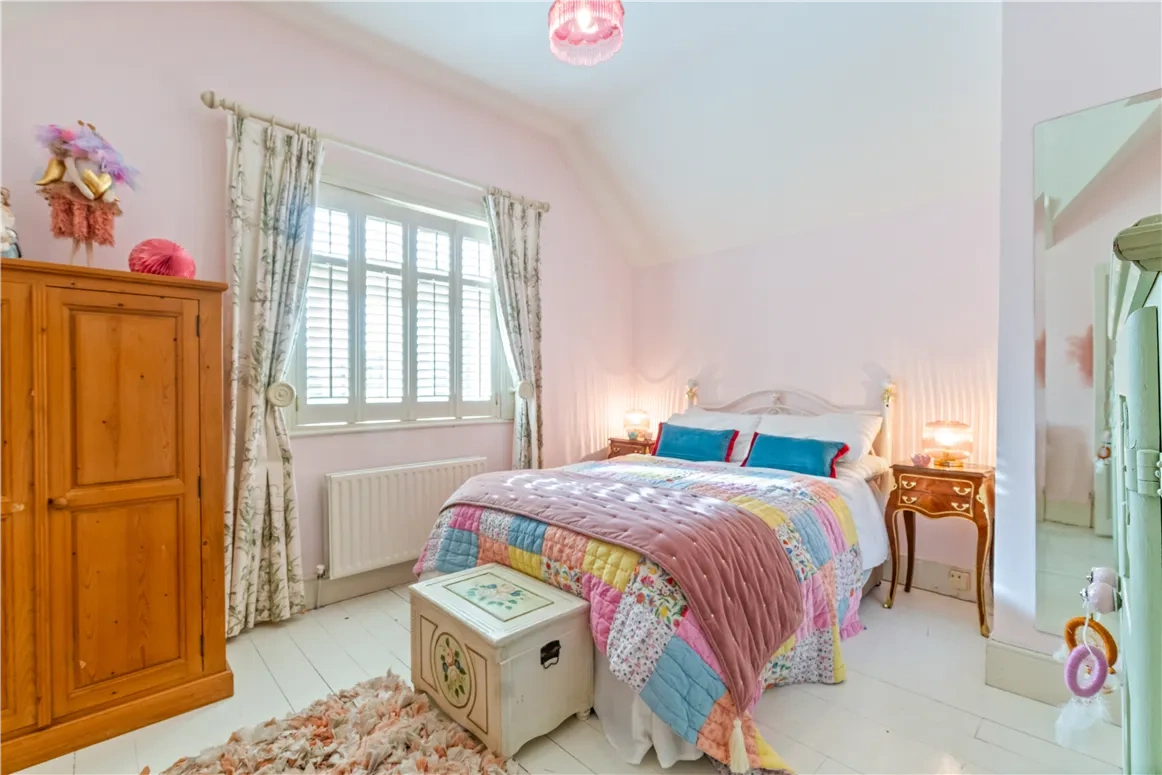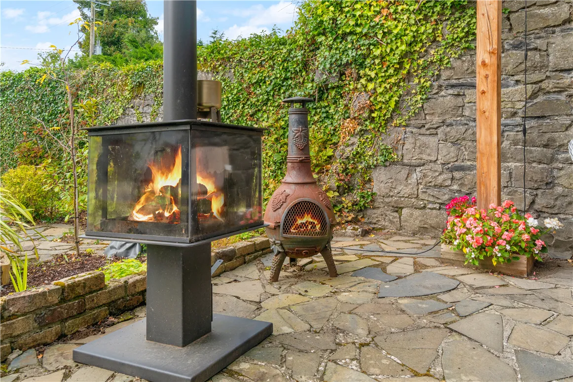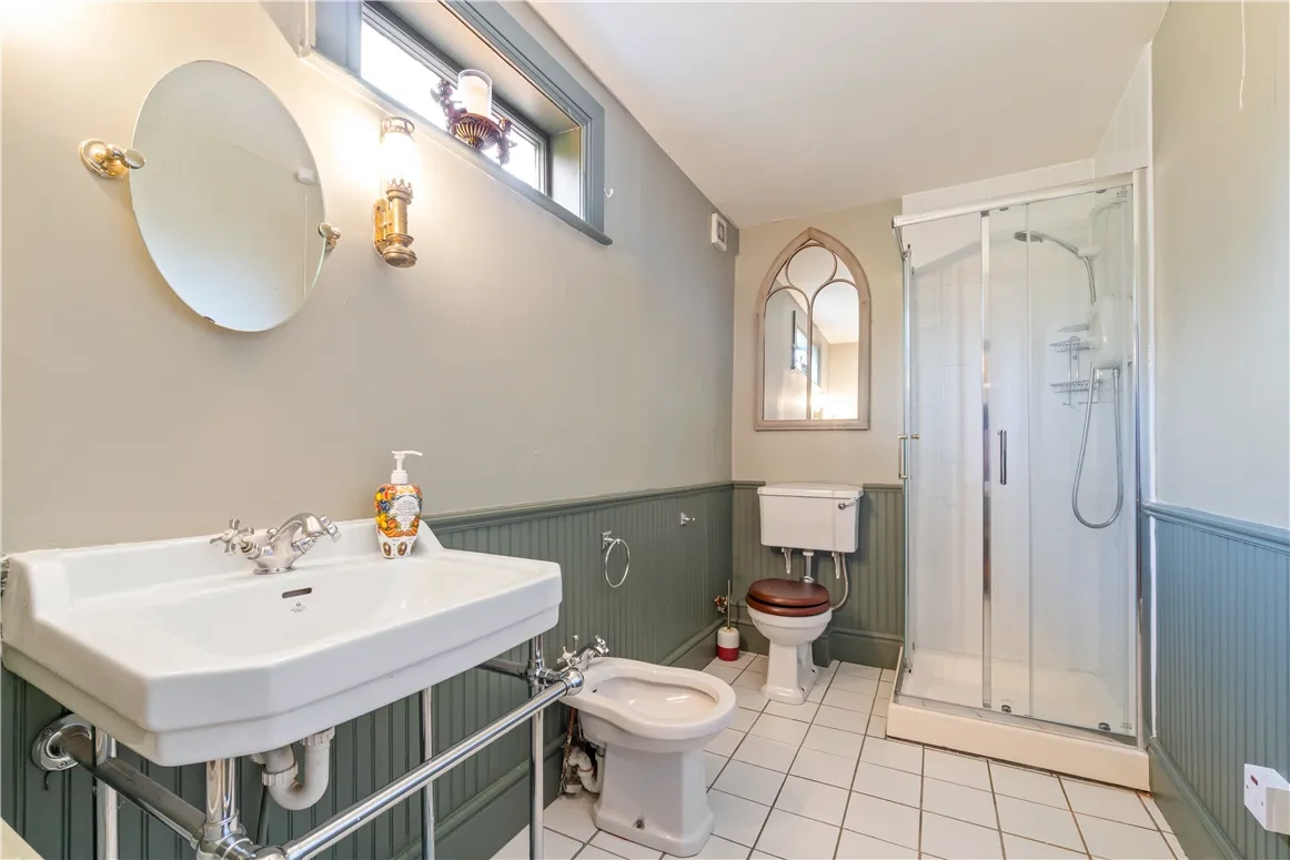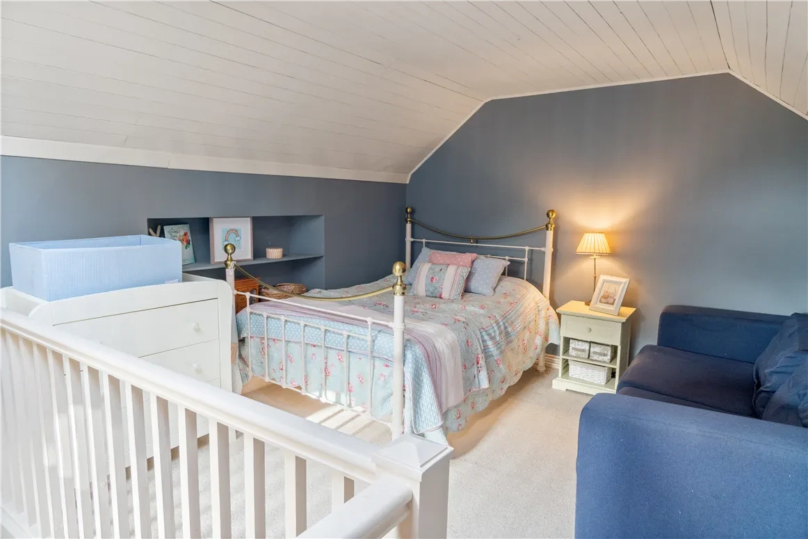 The utility room, located at the very end of the entrance hall, has direct access to the outdoors via a half door. On the ground floor, you will also find a large bedroom with its own cosy fireplace, built-in wardrobes and panelled ensuite bathroom, providing both convenience and comfort.