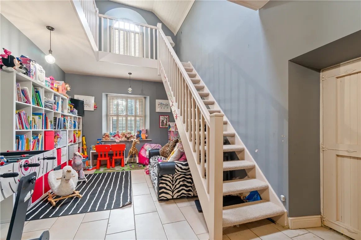A multi-purpose space offers huge potential capable of functioning as a large playroom, games room or office with its own cloakroom containing a toilet, hand basin and shower. A gallery landing leads to a bright mezzanine bedroom and reading nook with unparalleled views of the canal in daylight and the benefits of privacy afforded by shutters at night.