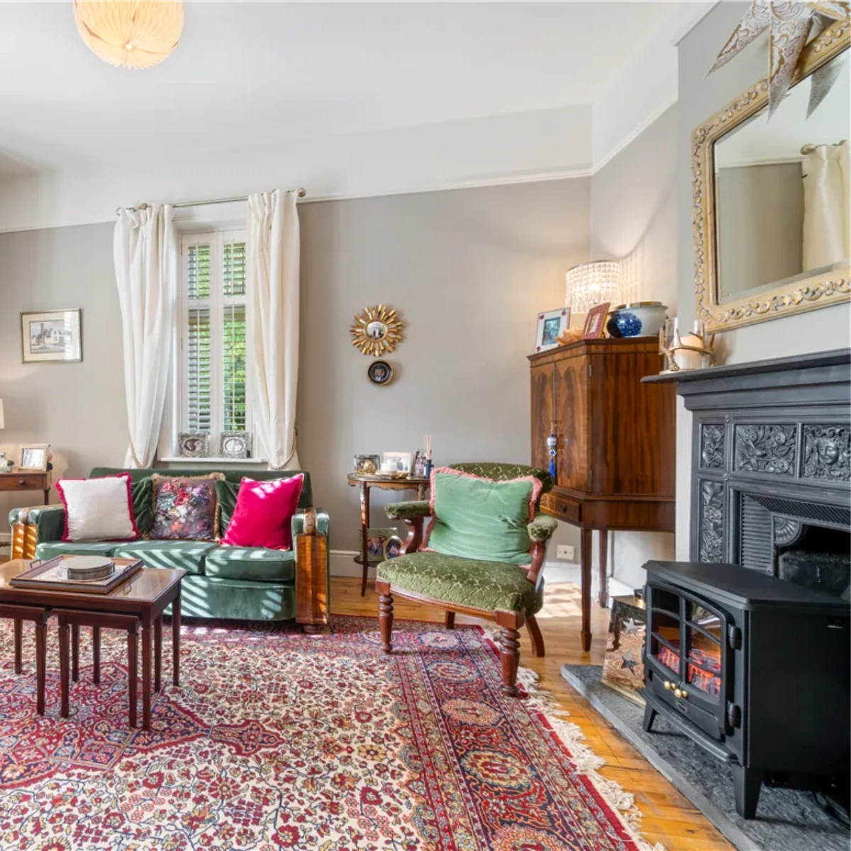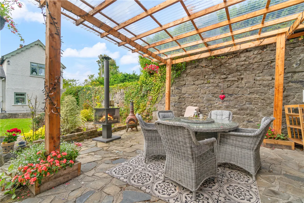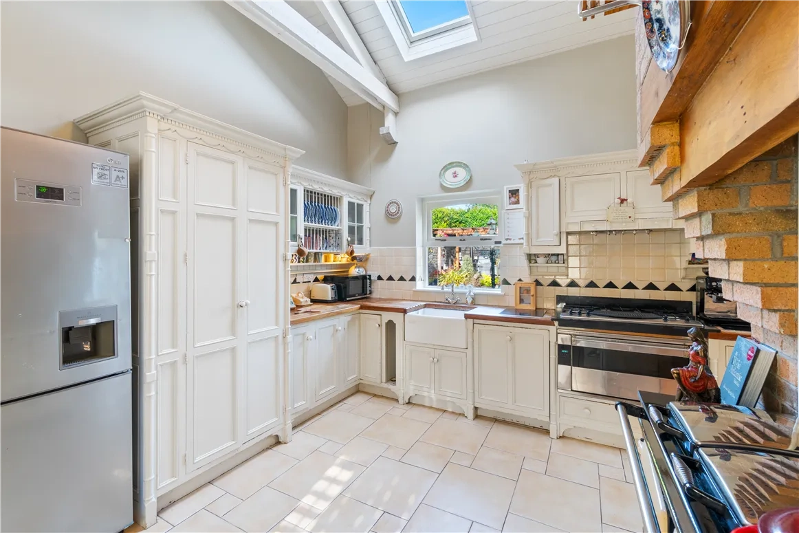 In the kitchen, a larder, Belfast sink and Smeg cooker take pride of place. French doors connect the dining room to the secluded rear garden where there is an outdoor BBQ space contained within a flower and light-filled pergola.