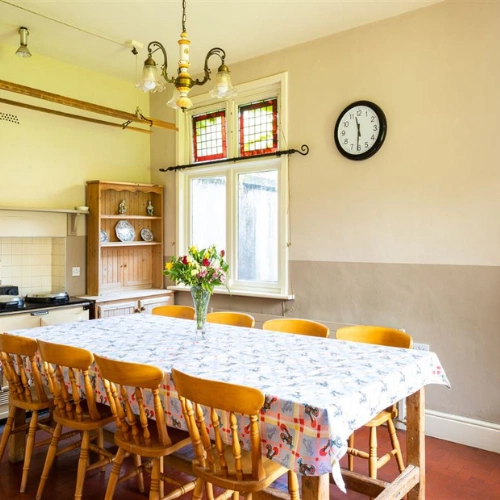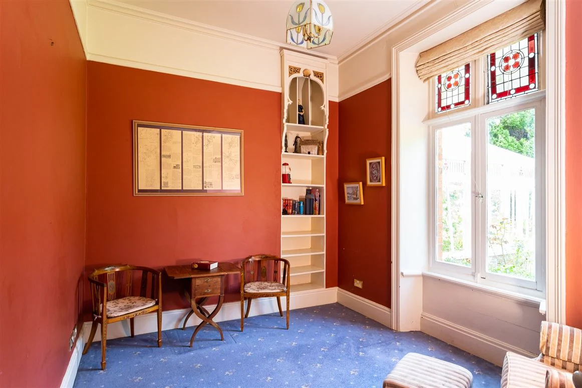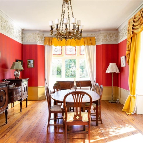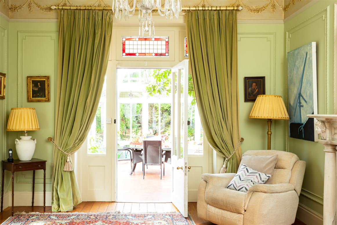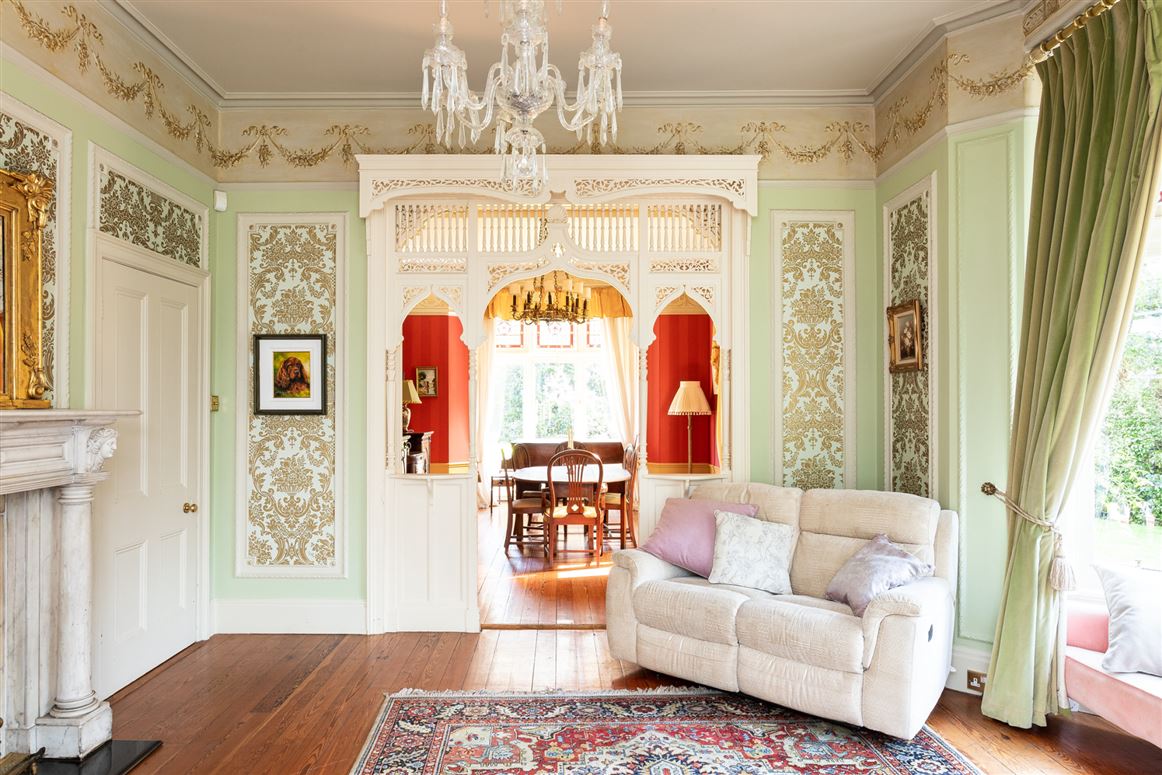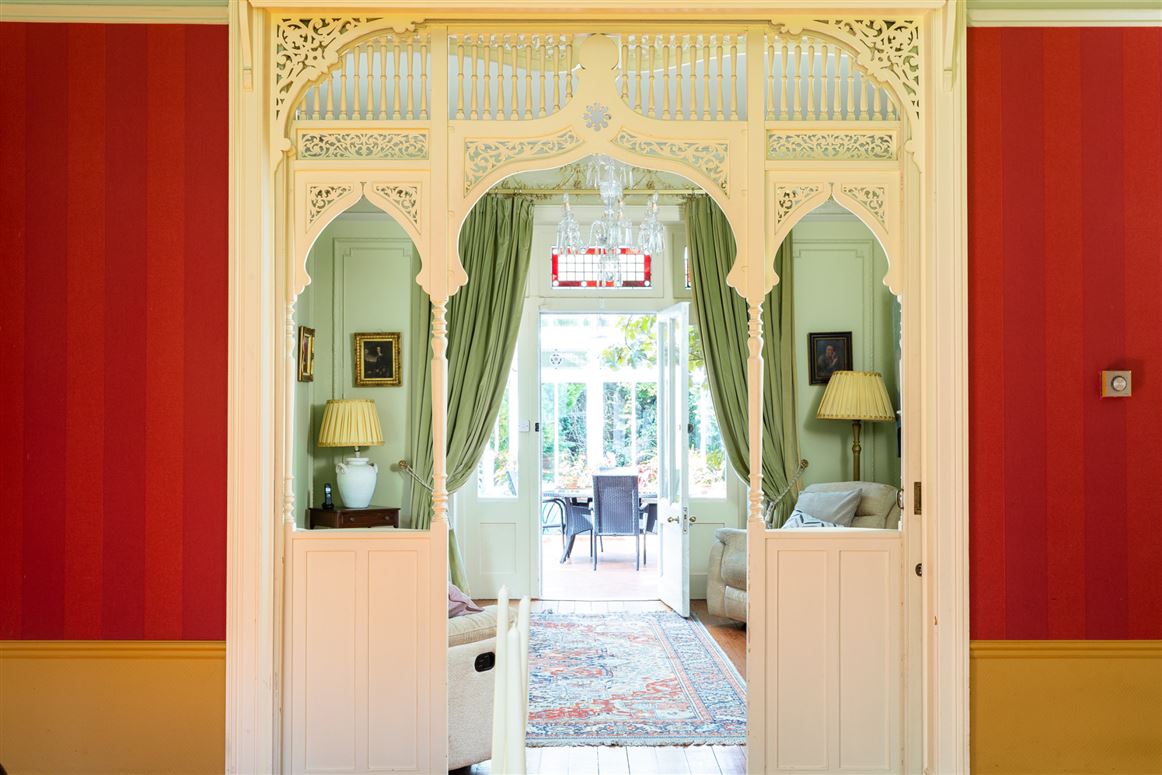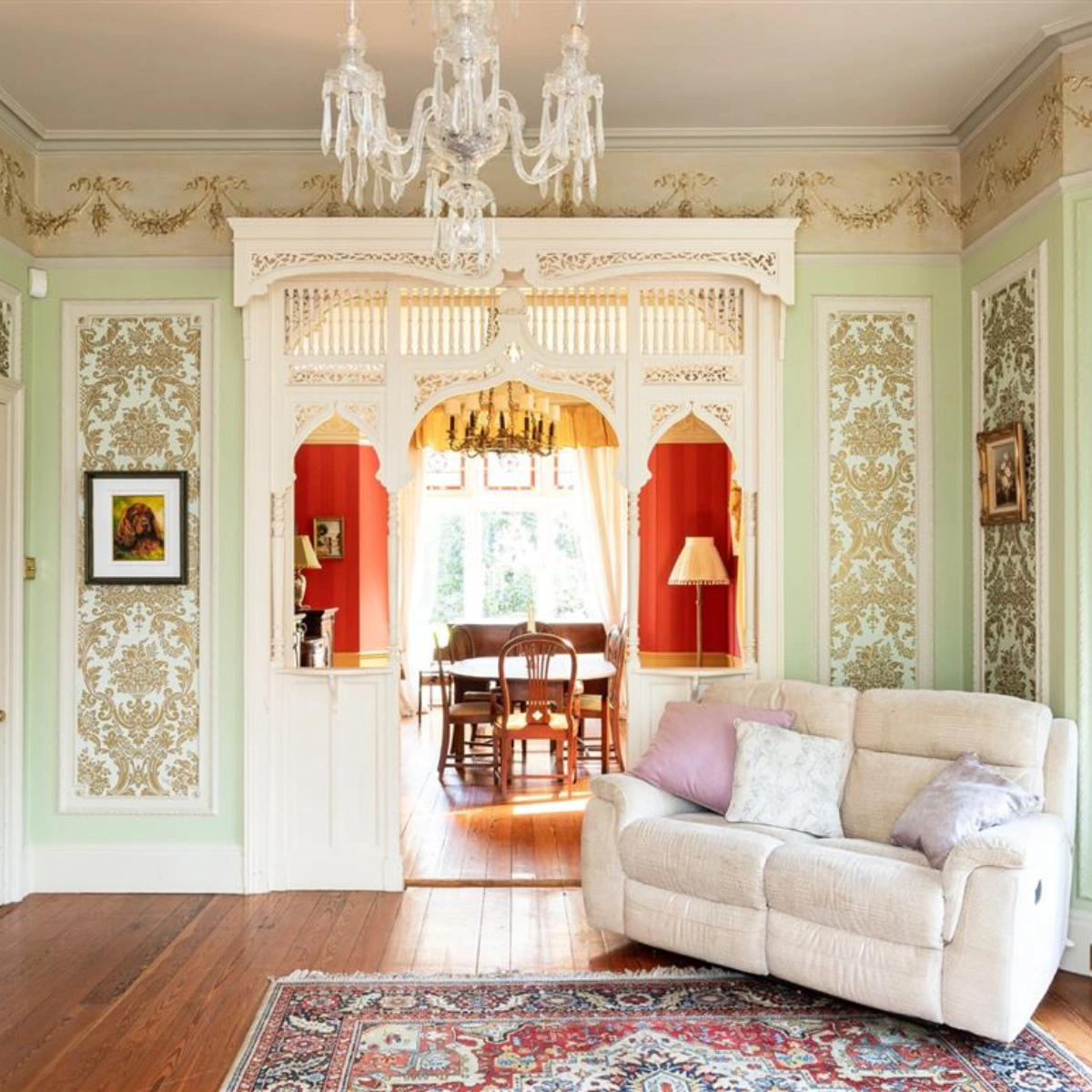 This home unfolds with a series of interconnecting reception rooms, each embodying the grandiosity of Victorian design. The opulent dining room, adorned with a box bay casement window and hand-painted stained-glass detailing, flows seamlessly into a formal drawing room. Here, sliding panelled pocket doors, graced with hand-carved screens provide an intimate setting for refined dining experiences.