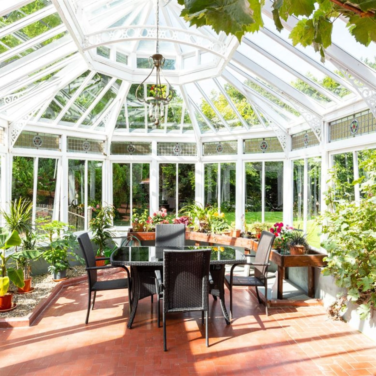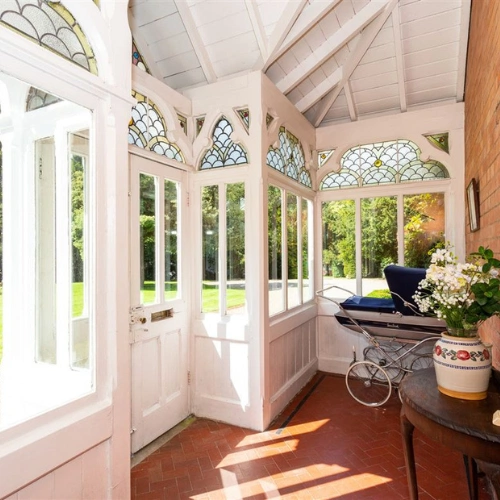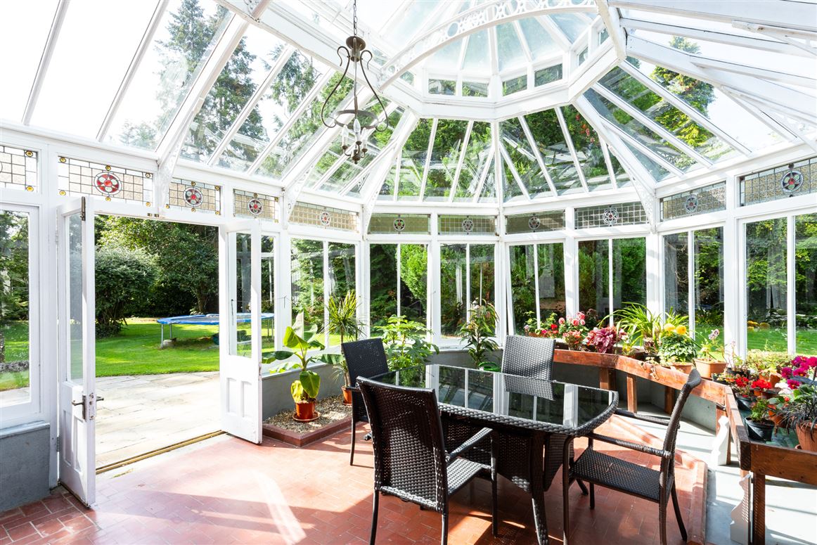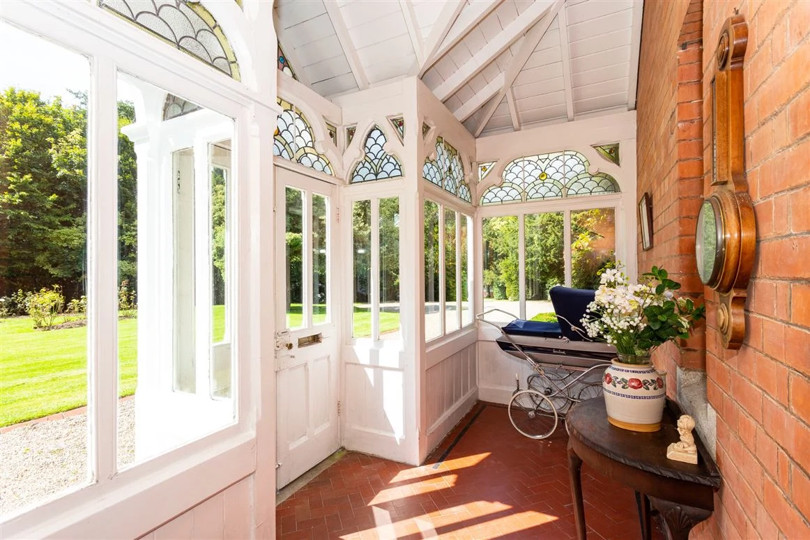 Just steps away, a sunlit Victorian conservatory awaits complete with French doors that also open to the garden. Elaborate cornicing and wall mouldings, chandeliers, marble fireplaces, and bay casement windows with stained glass detailing all contribute to a sense of timelessness.