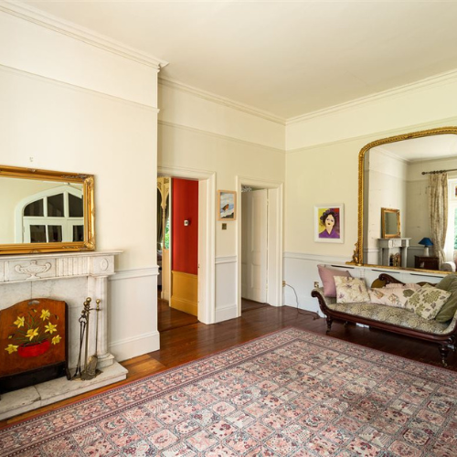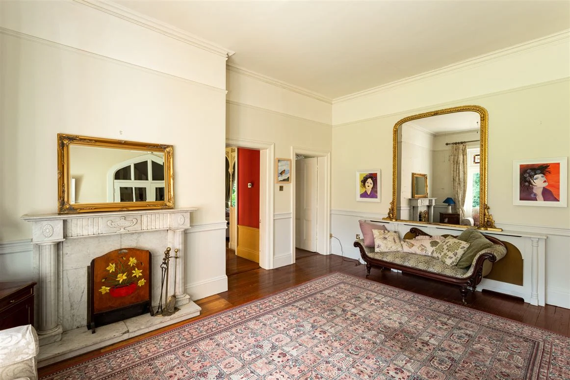 Further inside the property, a magnificent reception room awaits with a beautiful marble fireplace. Timber flooring adds warmth and character to the space, while adjacent glass doors open out onto the garden.