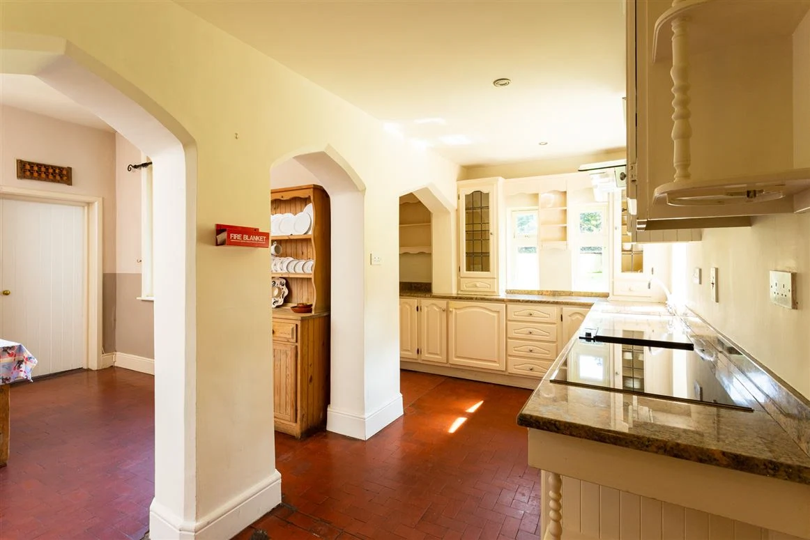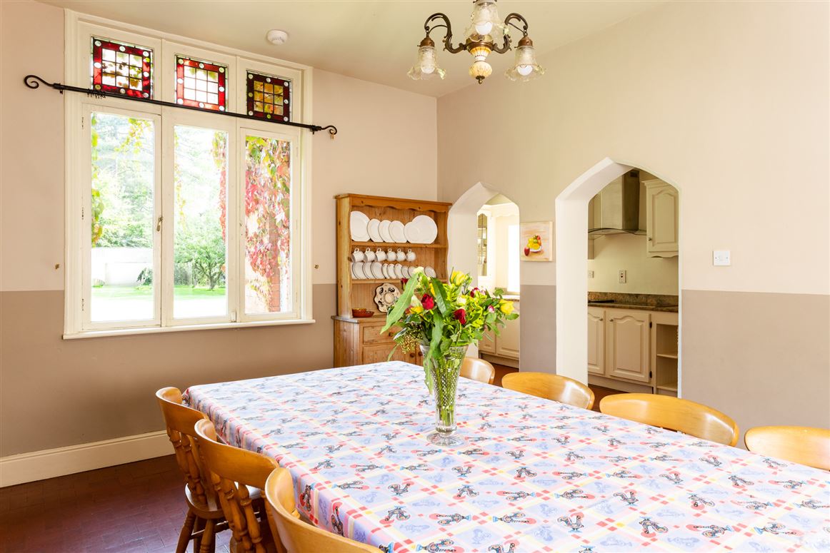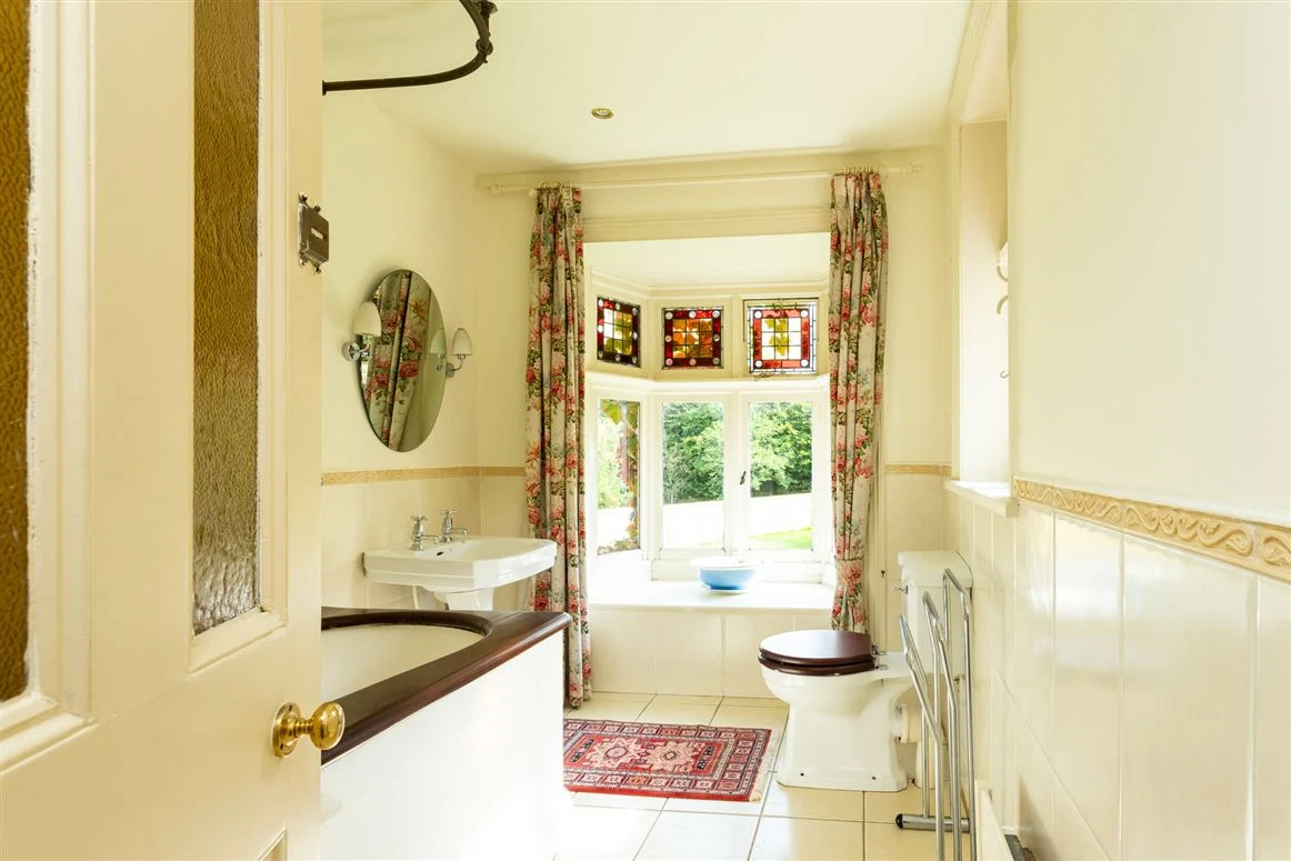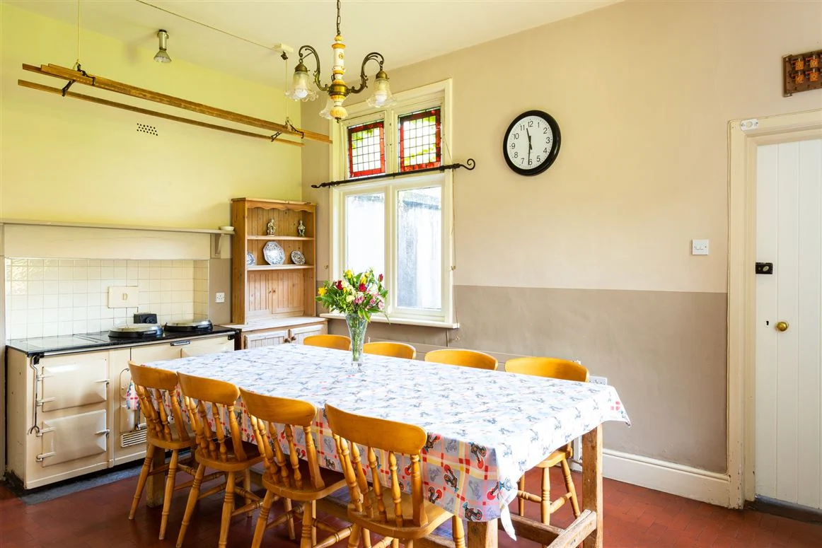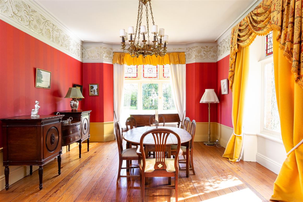 Elsewhere, the kitchen/breakfast room – the heart of the home – masterfully combines period charm and functionality. A classic four-oven oil-fired Aga and traditional Sheila maid evoke memories of another time, while free-standing units and an additional space fitted with units cater to contemporary needs. An adjacent utility room adds practicality, with a door leading to a cellar.