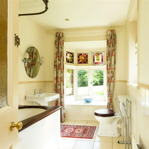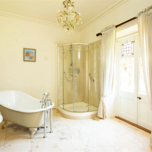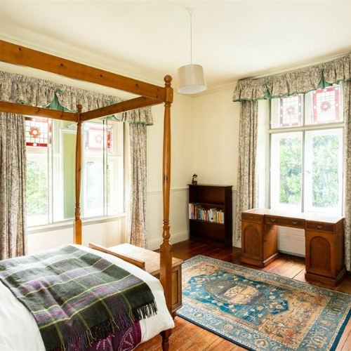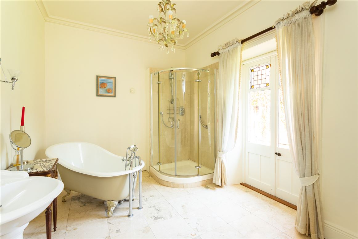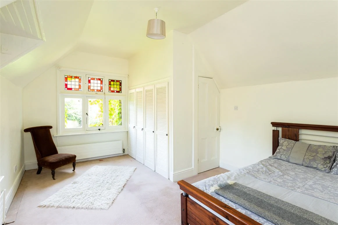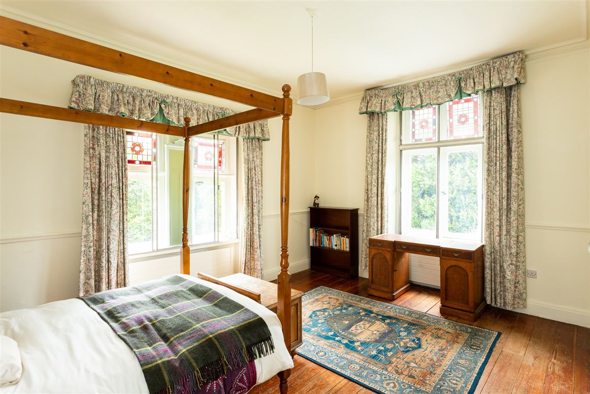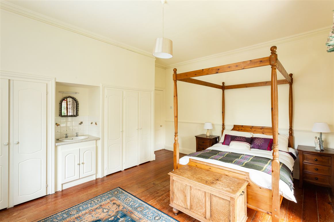 The master bedroom suite can be found on the first floor, accessed via an ornate hand-carved staircase. Bathed in natural light from dual-aspect windows, again with stain glass detailing, this room features custom-built wardrobes and a luxurious ensuite, complete with a shower, heated towel rail radiator, and a freestanding claw-foot bath. Double French doors open onto a balcony, offering incredible views of the garden.