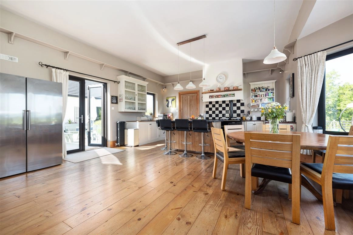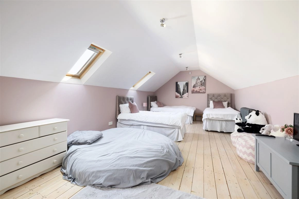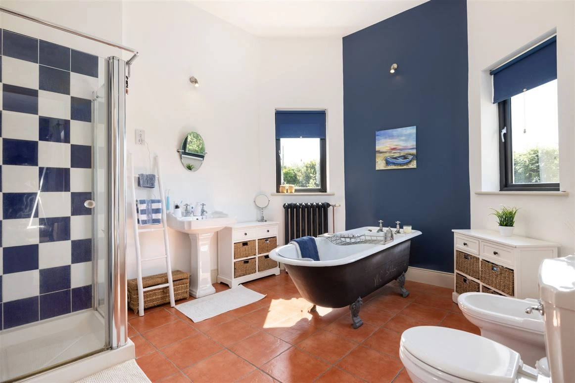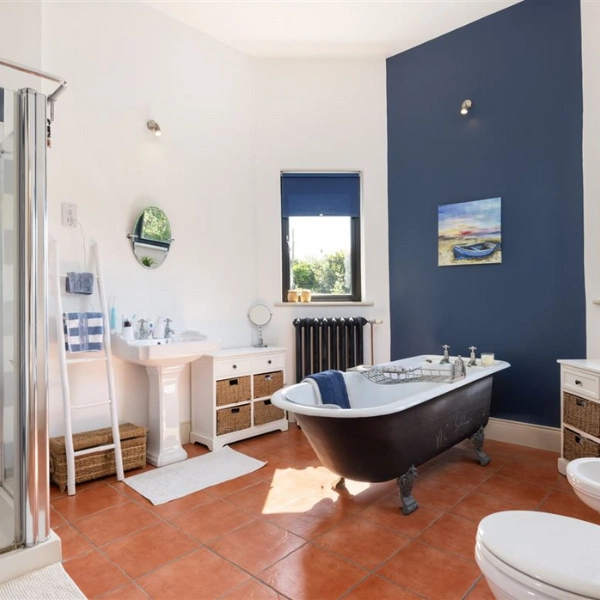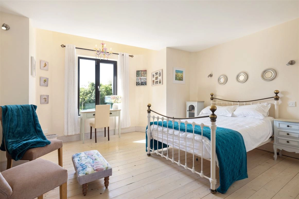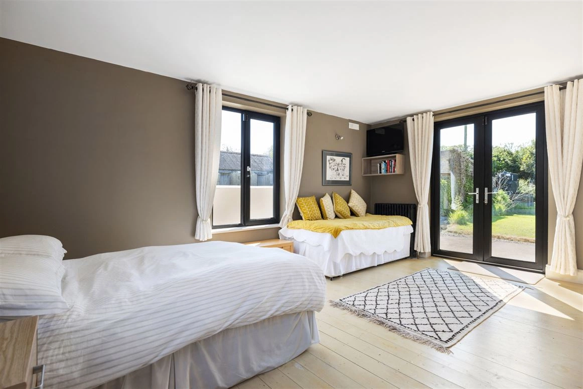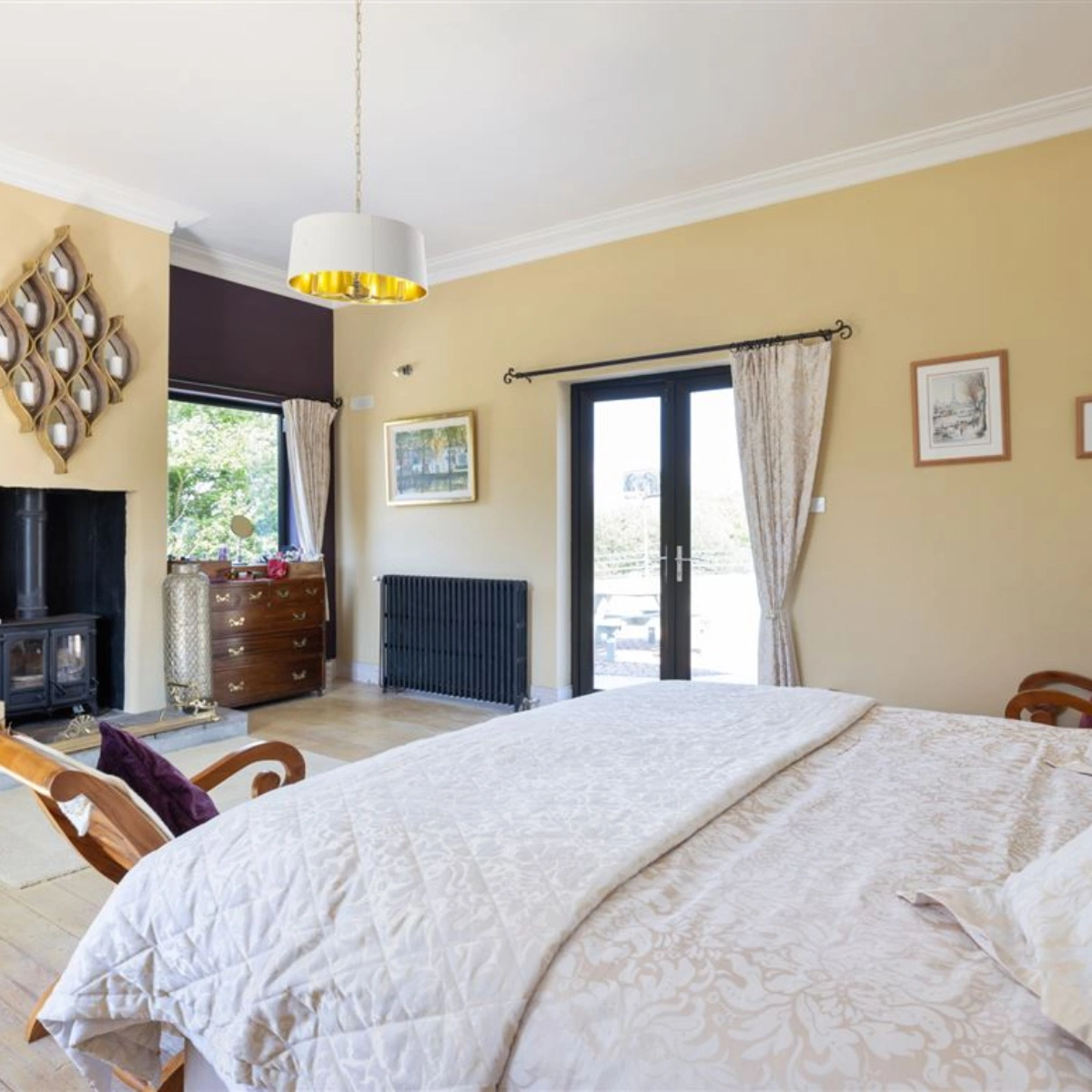 There are five large bedrooms in total, four of which are ensuite. The stunning master bedroom is incredibly spacious, overlooking the beautiful gardens which can be accessed via French doors. This room also has its own wood-burning stove, a private walk-in wardrobe that offers plenty of storage and a larger-than-average ensuite.