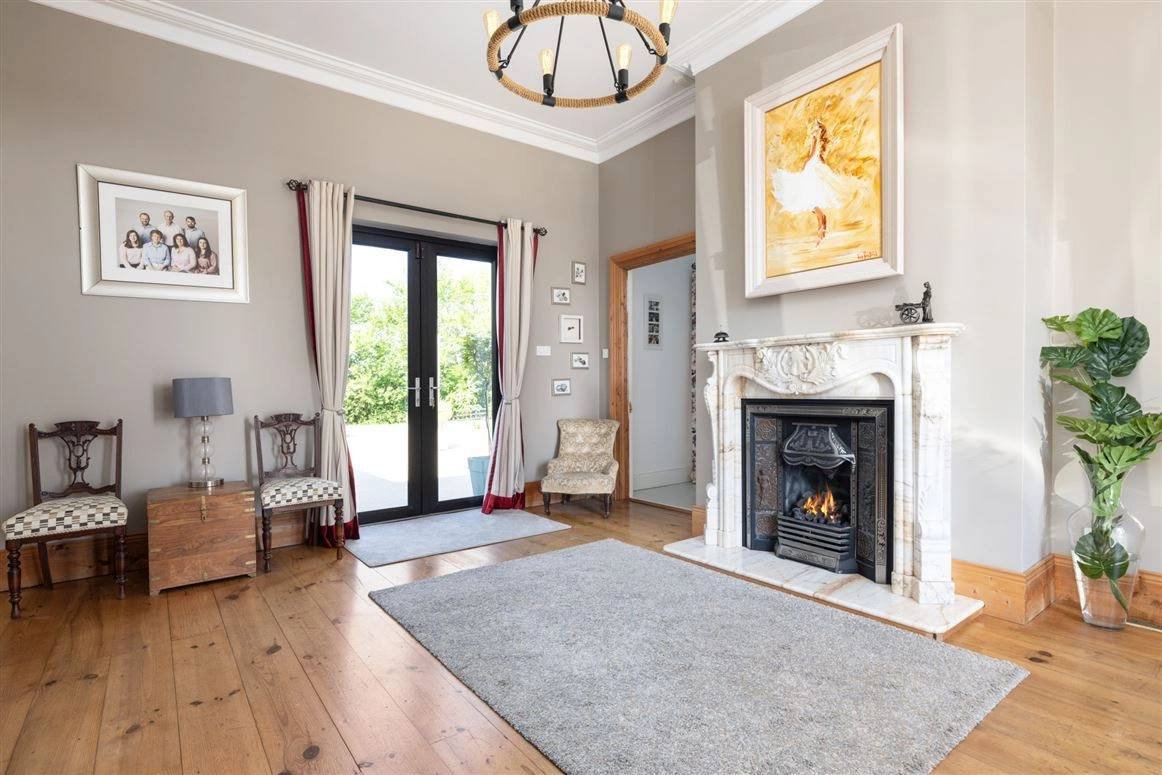 The decor is elegant and modern, finished to the highest standards to ensure the utmost comfort. The entrance hall has an impressive marble fireplace with a gas fire inset – ideal for warming the space on cold winter nights. The floors have been laid out in wood and access is afforded to all areas of the house from this central reception hall. There are French doors to the rear which open out to a suntrap terrace.