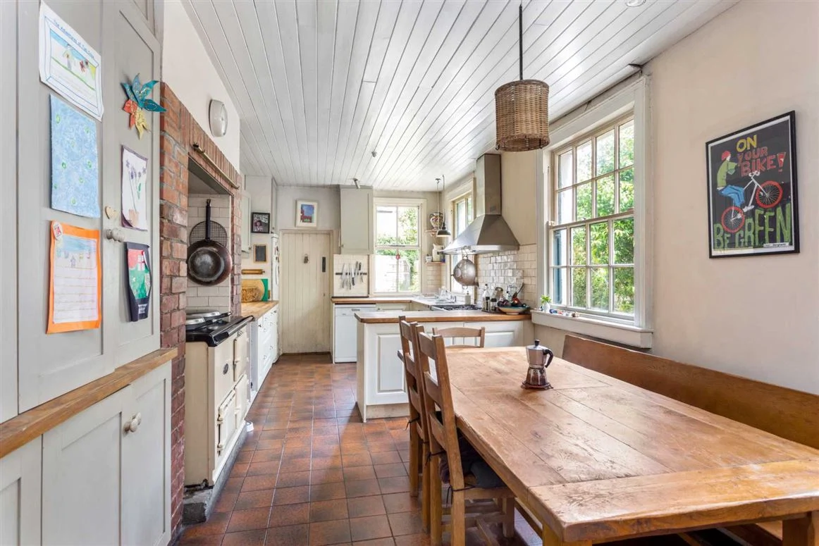 In the ground-floor return are a long and bright kitchen and casual dining space, with a country-style kitchen and two-oven Aga. Overlooking the garden, it’s a relaxing space and the continuation of the muted palette from the living spaces to here really give this house a flow.