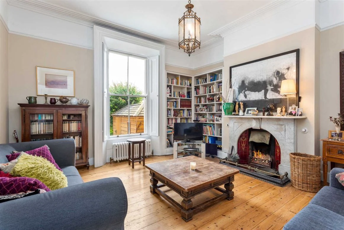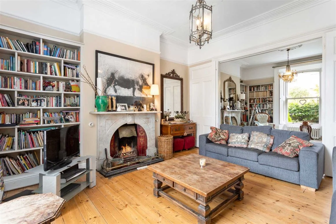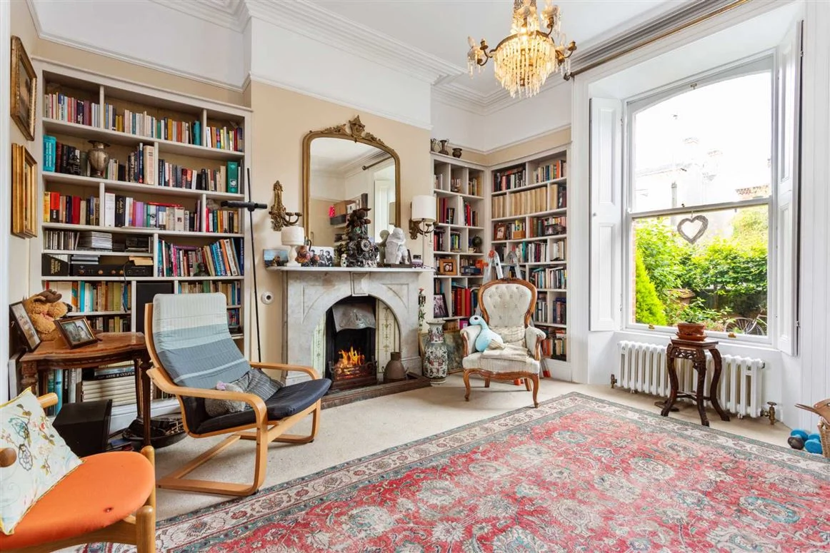 These rooms are bright and airy, thanks to the high ceilings and tall Georgian windows and can be separated by simply closing the folding doors. Built-in bookcases give the grandeur of the space a sense of cosiness.