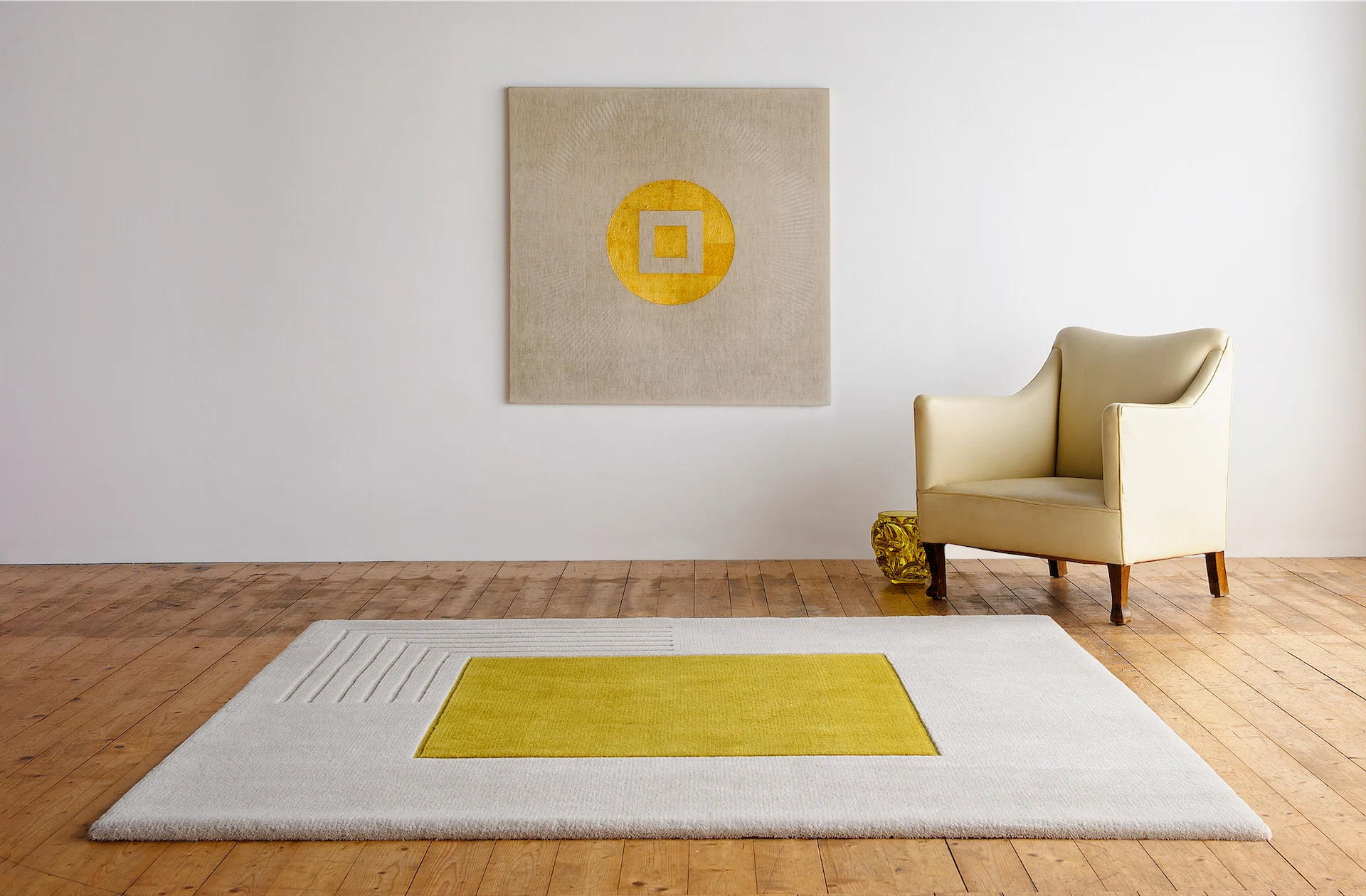 Entitled “resonance”, this deep wool rug is part of the Moyard Collection. Textures and geometry combine to form a striking, layered design. Available in ochre yellow on dove white (above) and florence gold on light mocha.