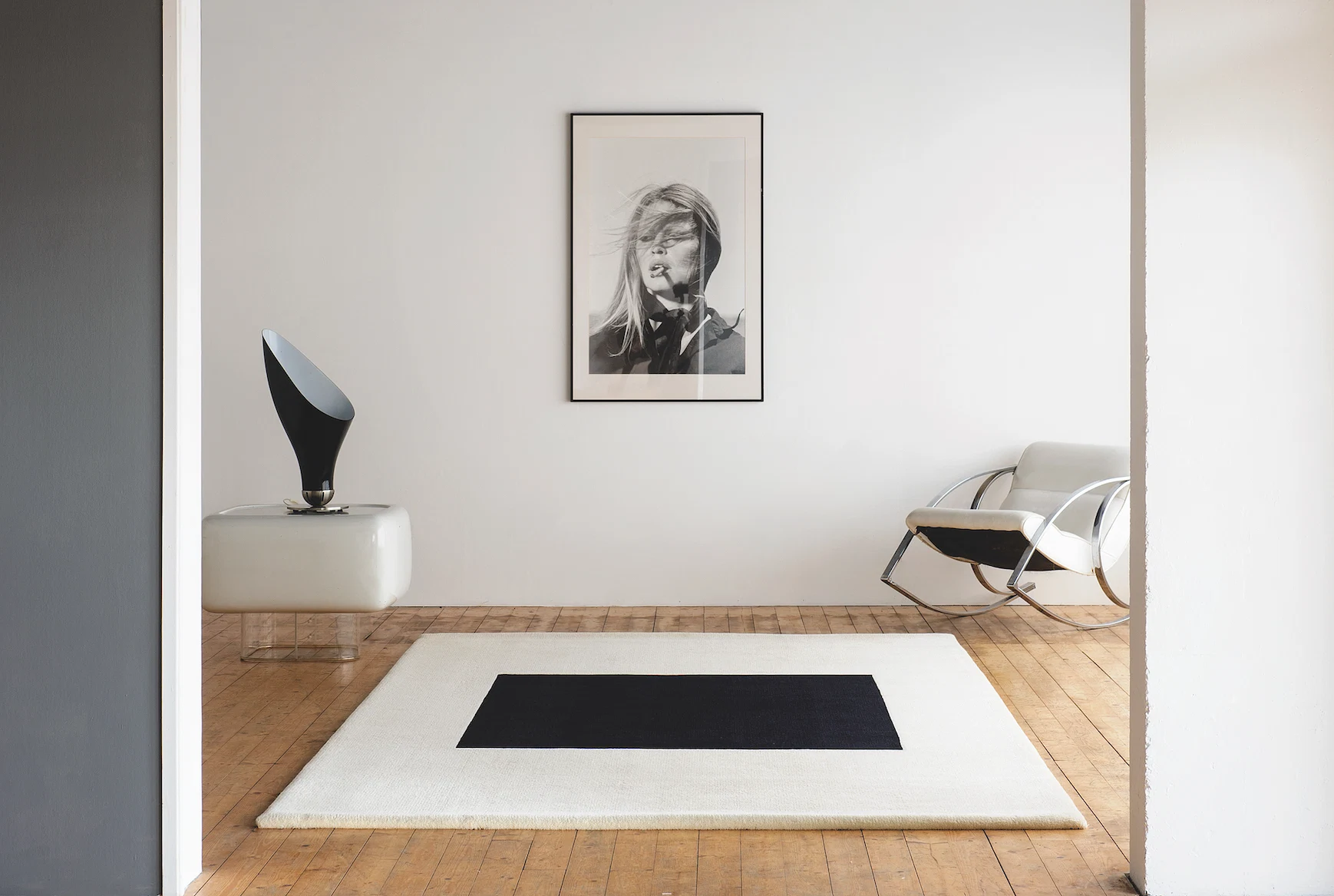 This deco, wool rug is simply black and white, showing a purity of design with classic contrast – a bold statement piece for a striking and simplistic space.
