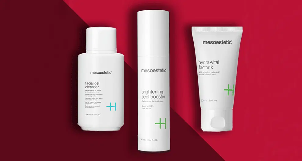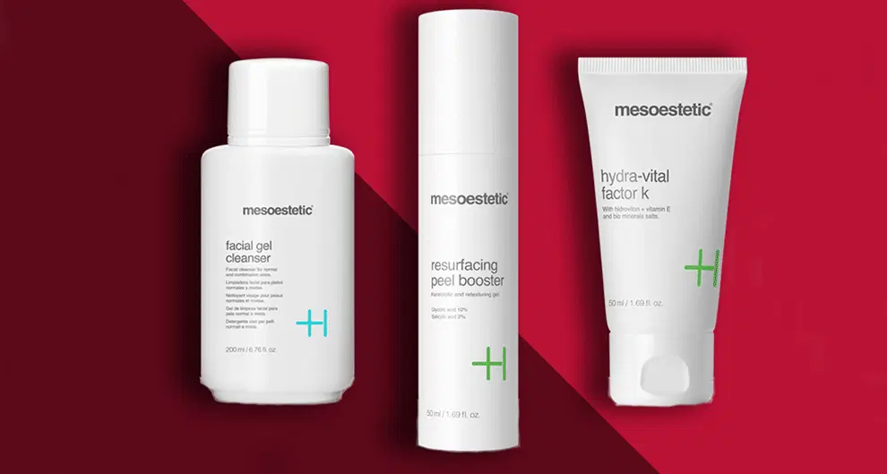“We prescribe a trio of products from Mesoestetic. A facial gel cleanser which leaves skin soft and matte, a moisturising cream that ensures protection of the skin against external aggressions and a renewing and lightening gel that reactivates cell renewal and increases skin hydration,” says Kerry.