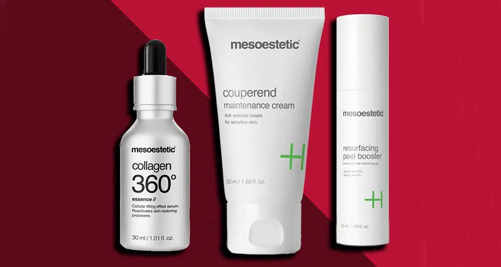 “This unique blend of products helps to diffuse redness. The couperend maintenance cream from Mesoestetic has soothing and decongestant ingredients that minimise skin irritation, while the collagen 360 serum improves the quality and resistance of skin tissue. The final product in this trio is a peel booster that unifies the texture of the skin and reduces the size of the pores,” says Kerry.