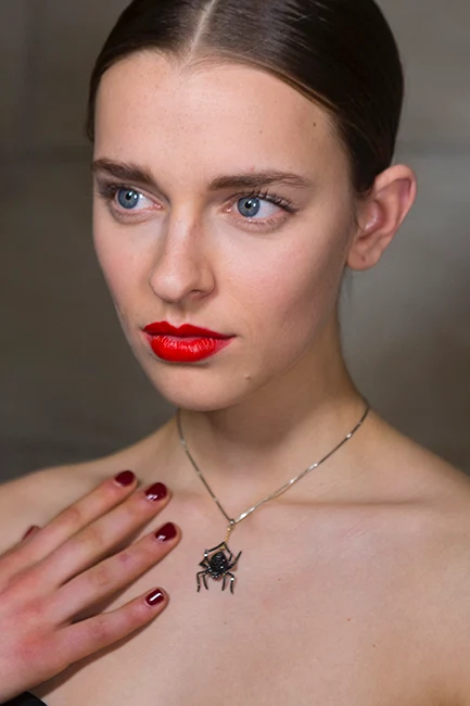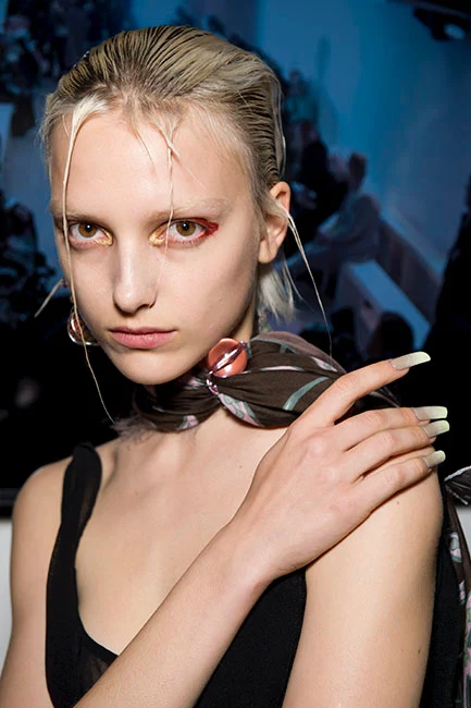 Forget what you know about nail shapes of the past and look to the future, specifically, the modern shapes seen on nails backstage at Halpern, Ashish and GCDS, where shapes were more angular talon than nail. As for the truly out-of-this-world, look to Mugler, where nail artist Sylvie Macmillan created ball-bearing surprise nails using BB gun pellets on the underside of the nail. Make that more practical by painting the underside of your nail; it’s the nail equivalent of a red sole.