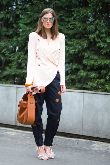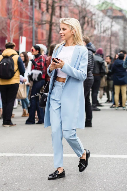 When reimagined in sharp tailoring, pastels look anything but saccharine. The black patent brogues also anchor this look,’making it office worthy attire. I’d skip the cropped top – a crisp white shirt or silk T-shirt would be a better choice for work.
