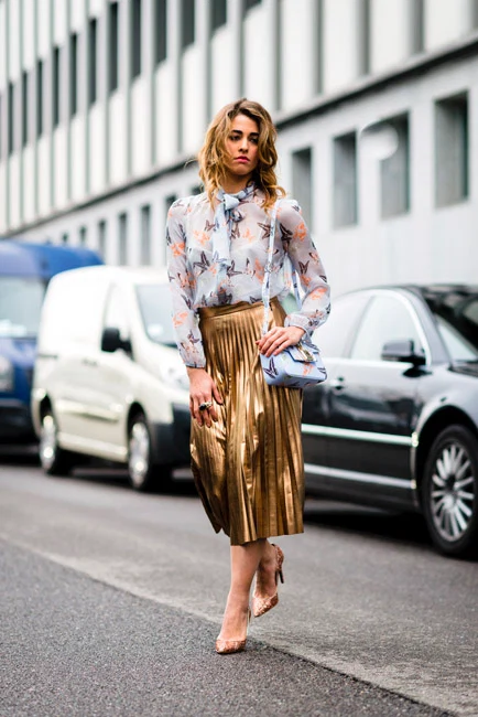 Turn traditionally Disco-esque metallics on their head by pairing them with a chic blouse and elegant court shoes.?Let the metallics lead the way, though, by keeping everything else soft and subtle.