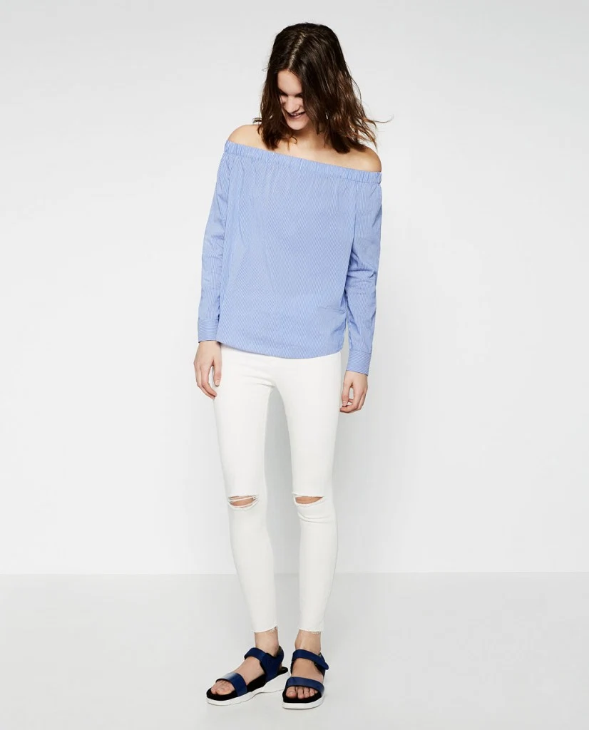 Skinny jeans have a rock chic kind of vibe, even in white. The slashed knees of these Zara jeans add a grungy element, which softens the “Daz” white feel of the denims.