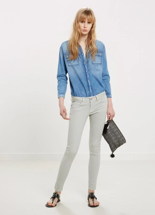 Choose a shade of chewing gum white instead of brilliant white for edgier appeal. I love how these jeans have been styled with double denim. Muddy whites also work better with black accessories.