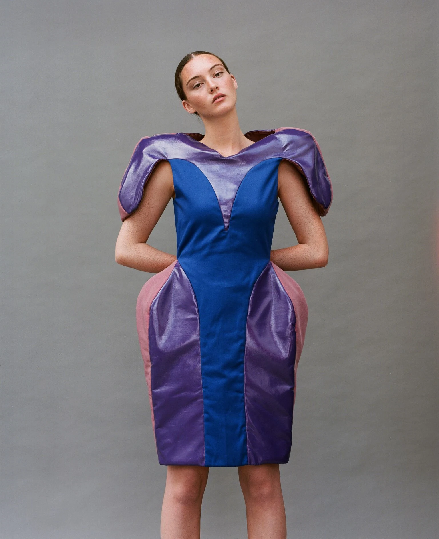 Aoibhin’s architectural designs were inspired by Irish boxer Katie Taylor. The collection hones in on her process in the ring, going from challenging structural garments to drape flowing and falling apart. The shapes project power. Dominant shoulders are met with defined waists, while hues of purple and cobalt augment the energy.