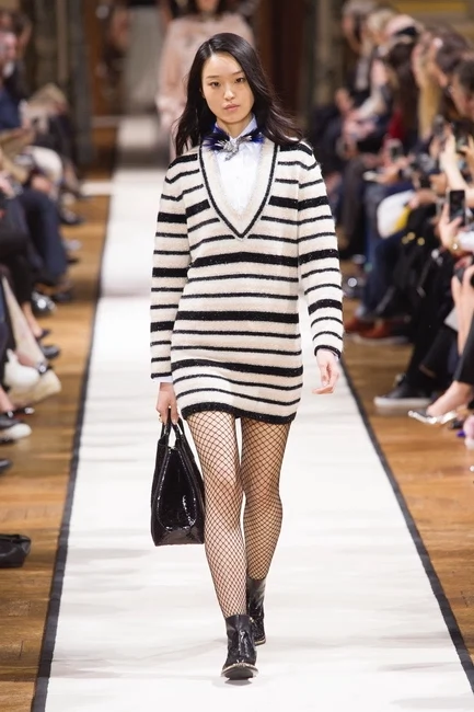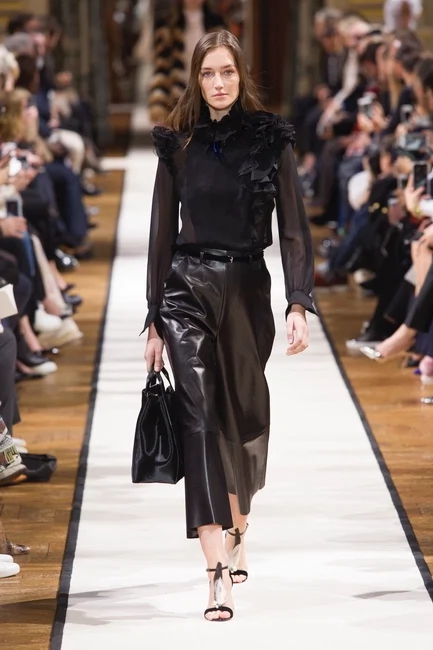 There were punctuations to the frothiness, of course: leather trousers, a sweater dress paired with fishnet tights, utilitarian boots in patent black and navy and an impeccably tailored black trouser suit. I loved the leather culottes worn with a high-neck, ruffle-trim blouse.