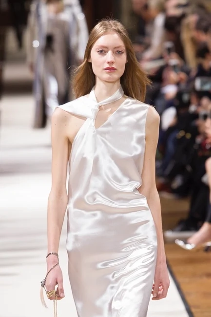 Slip dresses featured strongly, too, in a nod to fashion’s ongoing love for boudoir dressing. But there were no mix-matched paisley prints and PJs. It was a far more elegant affair in vanilla coloured silk satin dresses, one of which had a gorgeous twisted asymmetric neckline. Bags were mostly mini – more like jewellery – and feathers were a continuous motif, on shoes, jackets, belts, bags and collars.