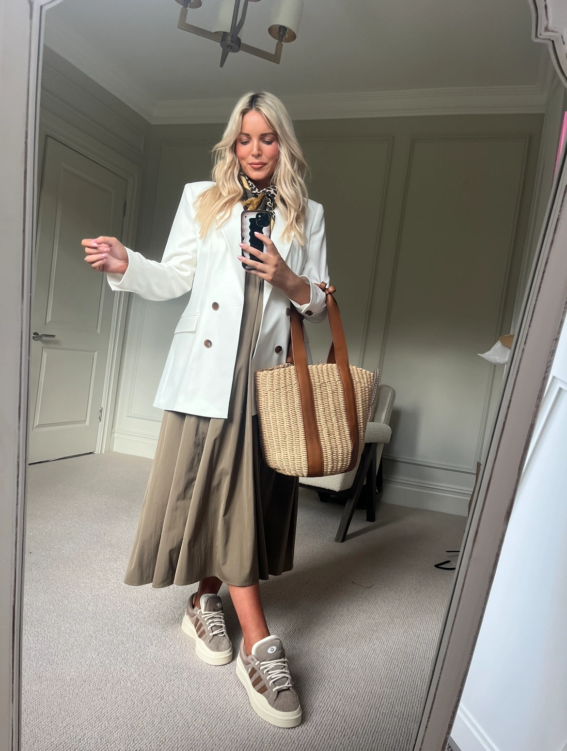 A comfortable and smart look for a new business meeting today. Meeting a prospective client, I feel it is important to turn up, show my style but not be too OTT so I went with an easy smart-casual look. I am at the stage of pregnancy where I have had to ditch the heels so a stylish pair of trainers is my new BFF. These ones are the Adidas x Bad Bunny trainers, my silk scarf is Dior, both my skirt and blazer are from Zara and I picked up the basket bag in Arket recently.